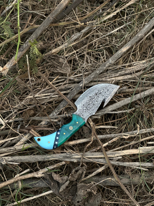 Elite Custom Handmade Damascus Steel Guthook Skinning Knife with Resin Handle - 7.5” Premium Blade with Leather Sheath