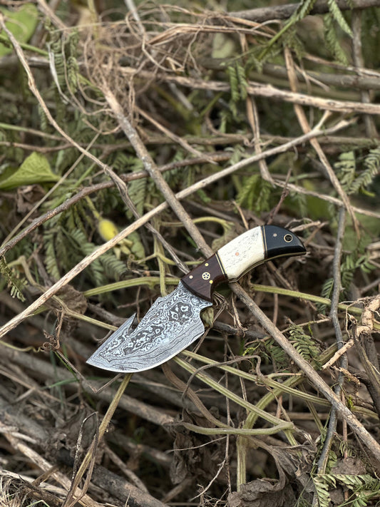 Custom Handmade Damascus Steel Guthook Skinning Knife with Rosewood, Camel Bone & Black Sheet Handle - 7.5” with Leather Sheath