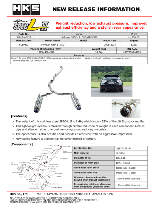HKS Hi-Power Spec-L2 Grb/Grf Ej20 31019-Af127