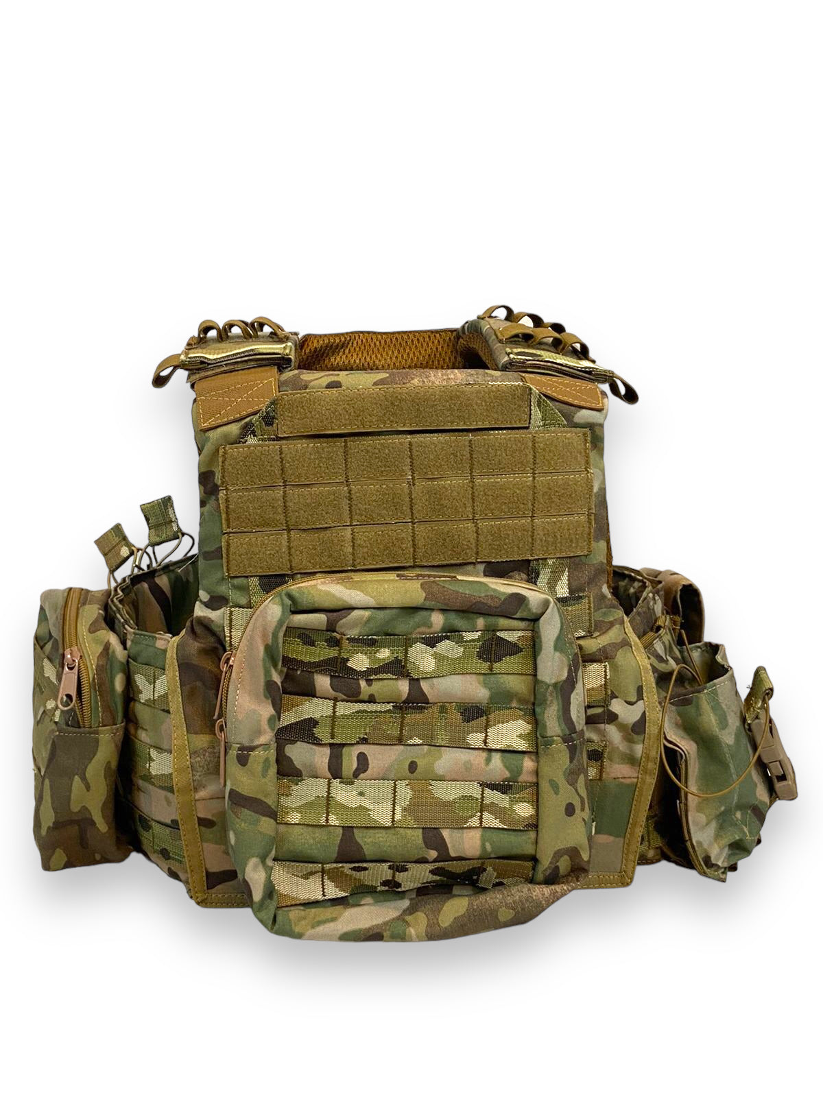 Full Assault Package Vest Plate Carrier is a battle ready plate carrier which comes with additional 6 MOLLE pouches. This Plate Carrier is made with Genuine Multicam® 500D Nylon Cordura fabric. Carrier has 2 pockets in front and back for hard and soft armor. Cummerbund can take 6x9 side armor in 2 separate pockets for soft and hard armor. Front Placard is removable and holds 3 AR Mags with removable inserts.