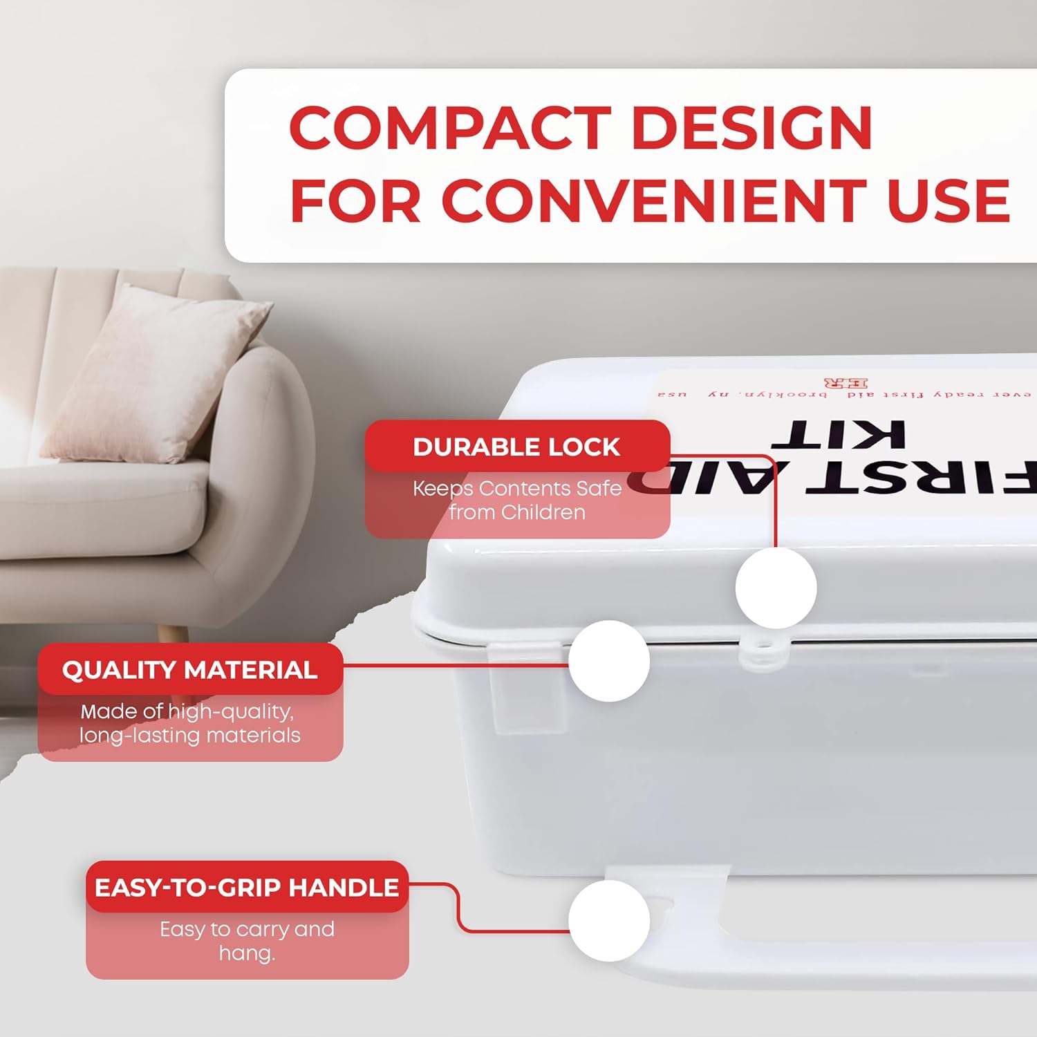 - Includes essential items like bandages, antiseptic wipes, gauze pads, gloves, and a first aid guide