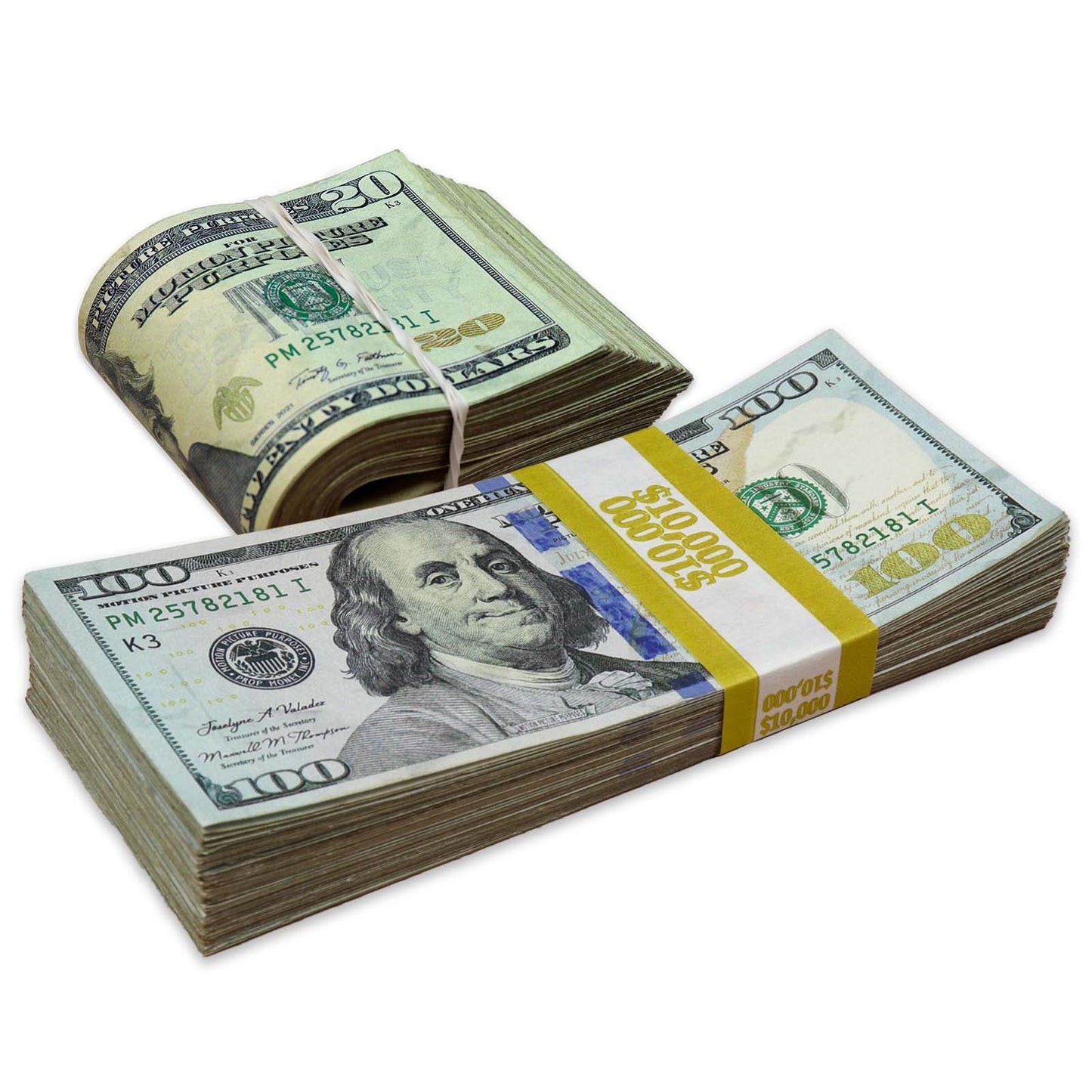 This pack includes one new series $10,000 full-print double-sided aged stack and one new series $2,000 full-print double-sided aged band. Carefully aged to look ultra-realistic, each includes one hundred bills amounting to two hundred bills, a total of $12,000. The non-glossy bills are of unmatched quality, detail, and realism making them perfect for music videos, movies, films, TV, ads, and more.
