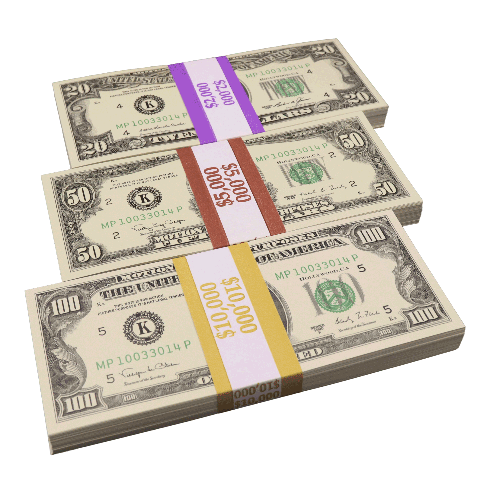 These prop money stacks are perfect for any 90s-series production. Included are three Full Print Stacks in $20, $50, and $100 denomination bills. Each stack includes one hundred bills. Non-glossy, unmatched quality and detail makes these double-sided bills look like the real deal, perfect props for movies, film, music videos, ads, and more.
