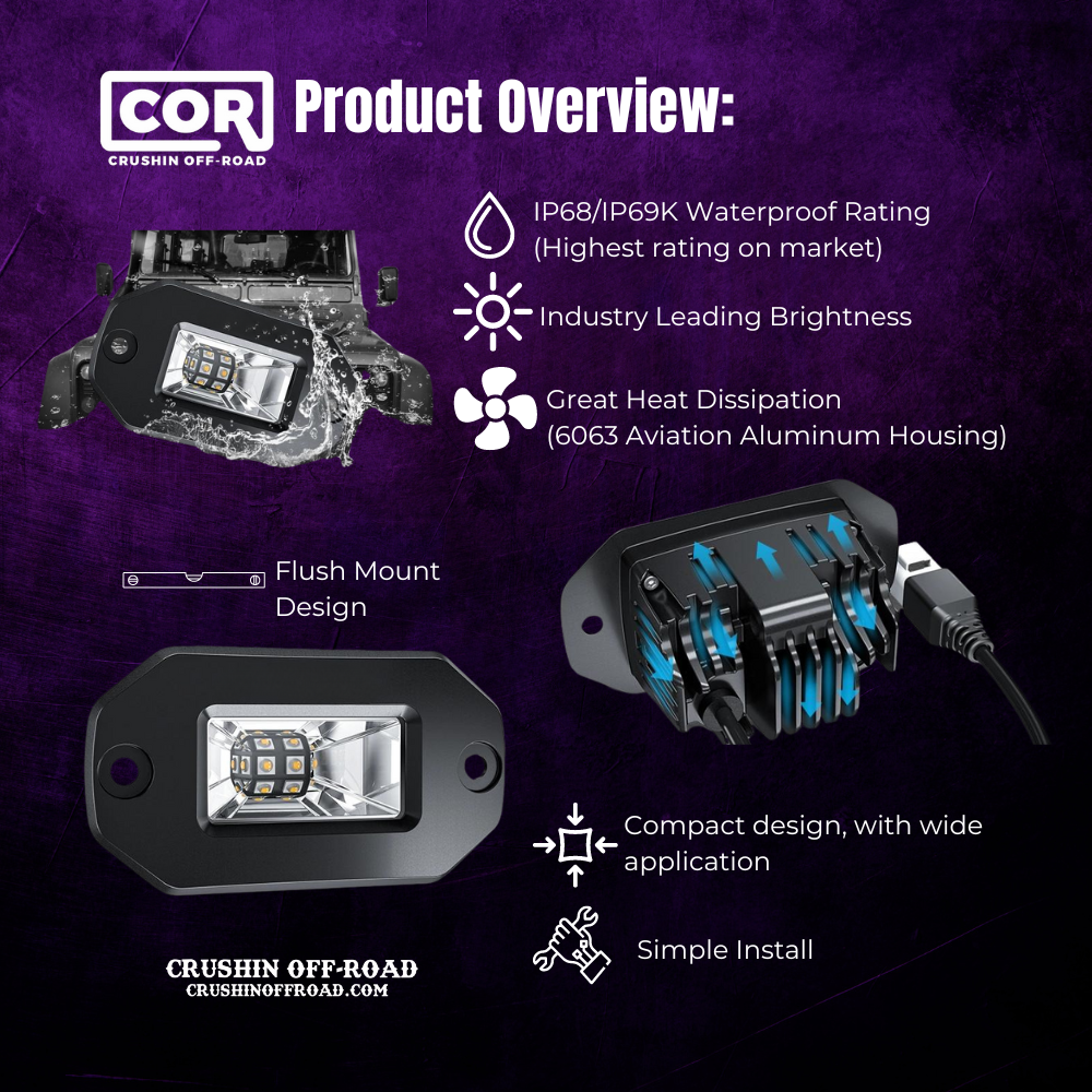 Nice clean option for mounting a flush mount light. With the comfort of knowing the longevity of this product, you can feel comfortable mounting this light about anywhere! This light is rated for IP69k. Feel free to muddy it up and run through the car wash!!!!