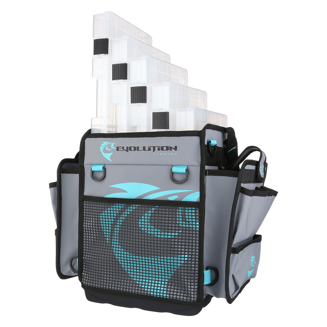Make your kayak fishing expedition a great experience with our all-new kayak series of bags. Specifically designed to meet the needs for Kayak Fishing, our Evolution Fishing Kayak Series Tackle Bags not only look awesome but provide the ultimate in functionality wherever you're fishing. With plenty of storage, you'll love the open top feature as the bag is completely zipperless to provide easy access to your trays & accessories. Its Tarpaulin Construction provides water-resistance and increased durability while the EVA Molded bottom provides great stability and resistance to water pooling. It also includes 2 rod holder tubes on the backside and has multiple D-Rings to tie down the bag or clip on tools. With plenty of storage, the Kayak Series Tackle Bags have a large, front mesh slip pocket, large open side accessory pockets, and as a plus, each side accessory pocket has quick access tool slots. Side pockets on this bag are also compatible with our 3600 tray and Kayak Bait Binder. To keep the trays secure, this bag includes a tray security strap with integrated grab handle. Transporting your bag will be a breeze as it includes 2 multi-use shoulder straps that can be used to tie down the bag or use as backpack straps if needed. The Kayak Series Tackle Bag from Evolution Fishing will provide unsurpassed functionality even to the most avid Kayak Angler.
