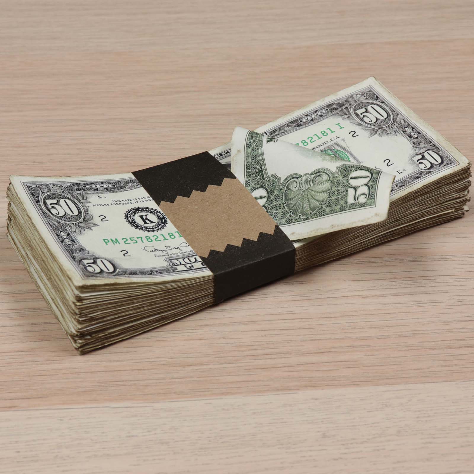 Our $5,000 1990 Series Aged Full Print Stack is perfect for film, TV, advertising, music videos, and more. This stack includes one hundred $50 1990 Series Aged Full Print bills for a total of $5,000. The non-glossy bills feature unmatched quality, realistic detail, and are double sided. Plus, you'll get the money band and the closest look to real money without breaking the bank.