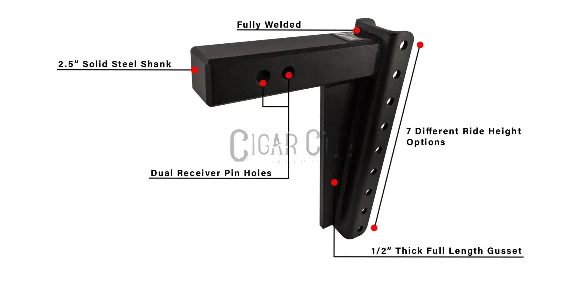 The 2.5″ Heavy Duty 12″ Drop/Rise Hitch from Bulletproof Hitches is built to handle the most extreme towing needs. With a full 12″ of vertical adjustment, this hitch is ideal for lifted trucks, oversized tires, and trailers that require maximum height correction.