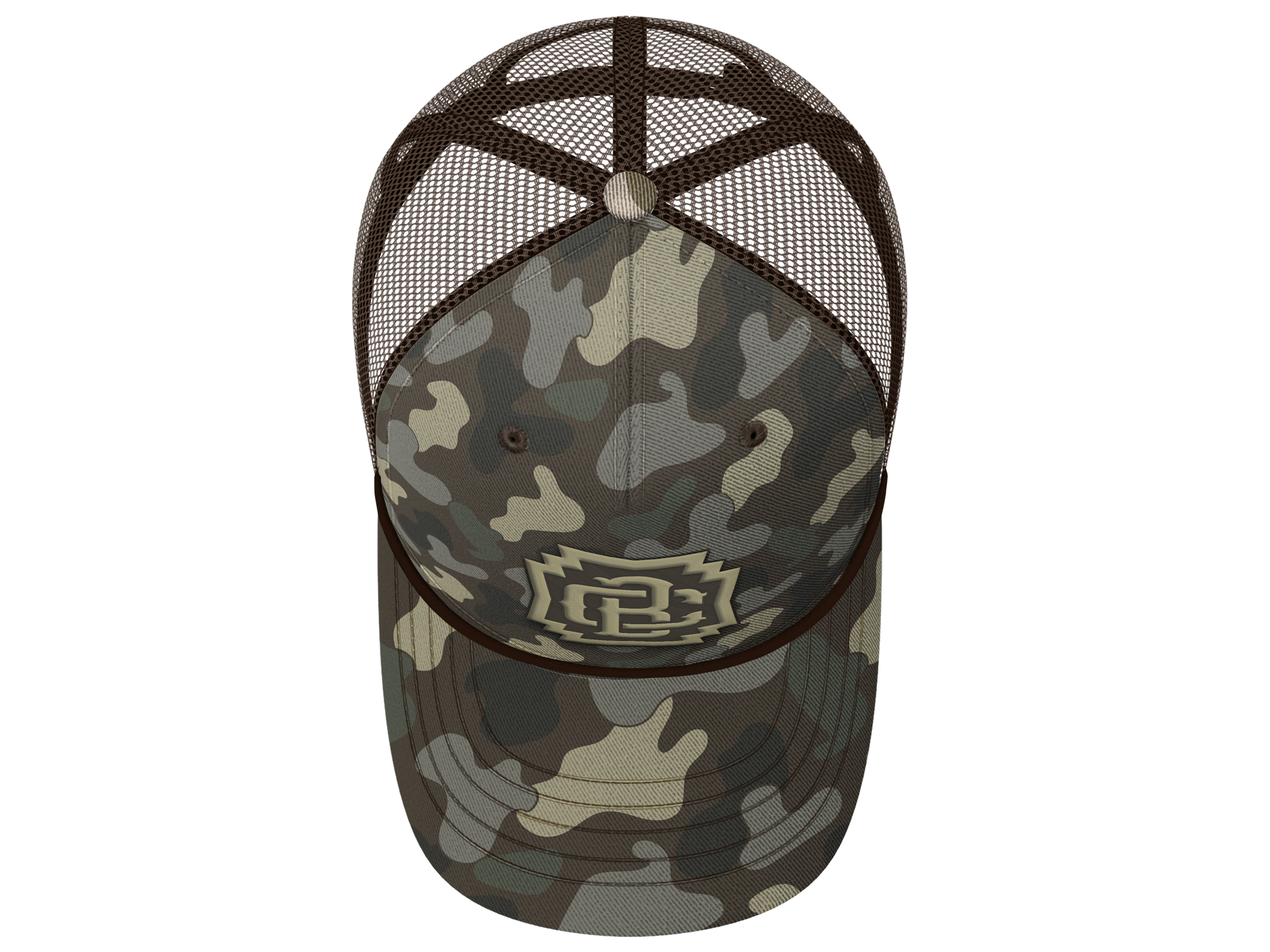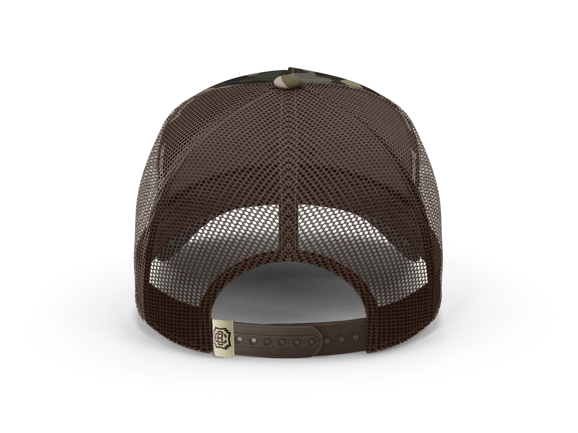 Capitan Boots 3D embroidered logo on a canyon camo and brown mesh back trucker hat. Shade your eyes and look good doing it.