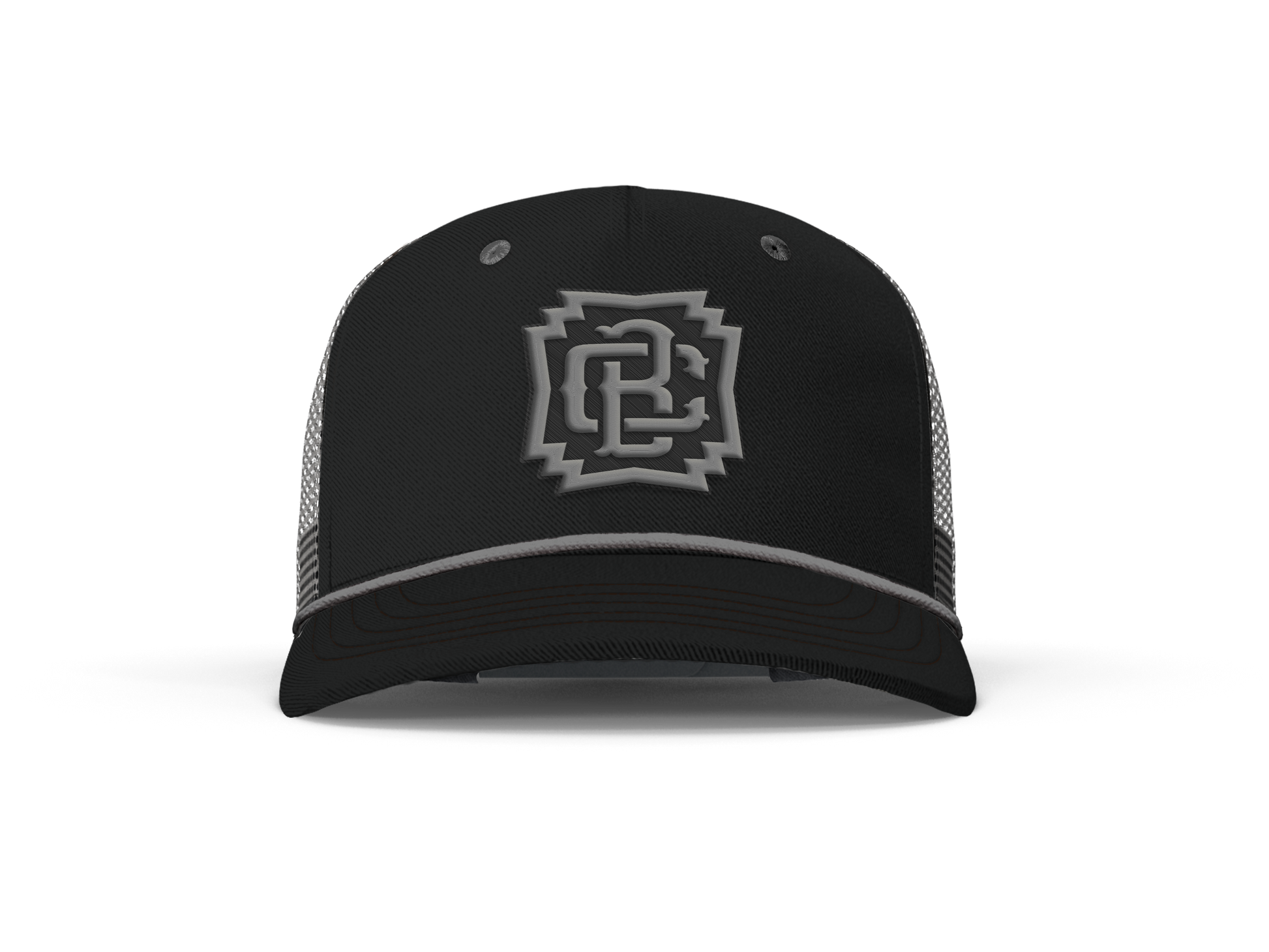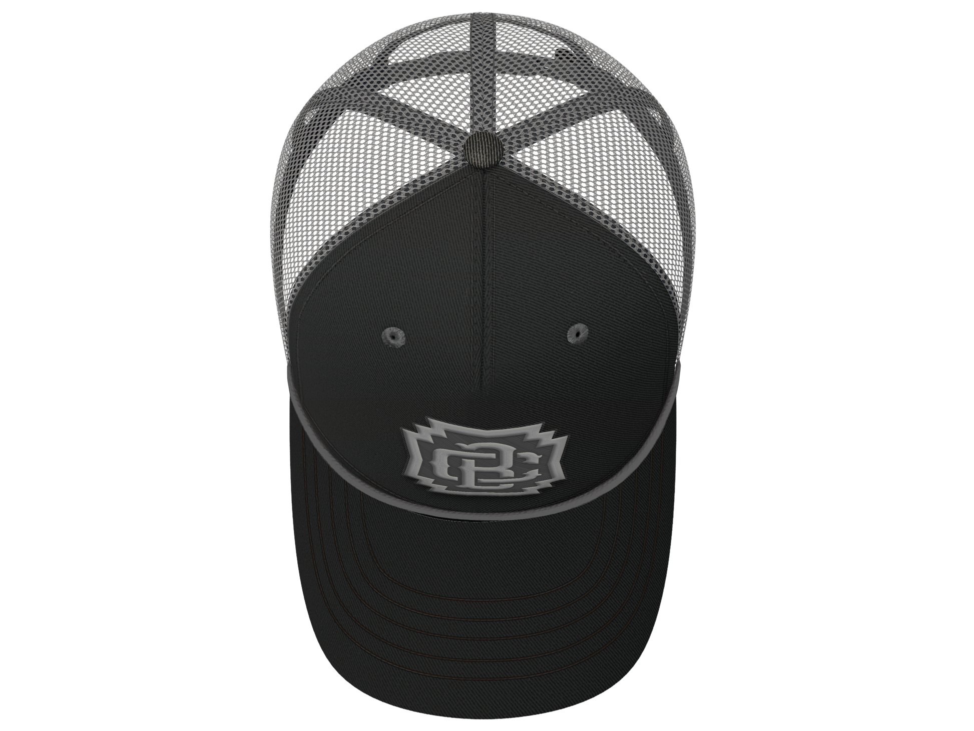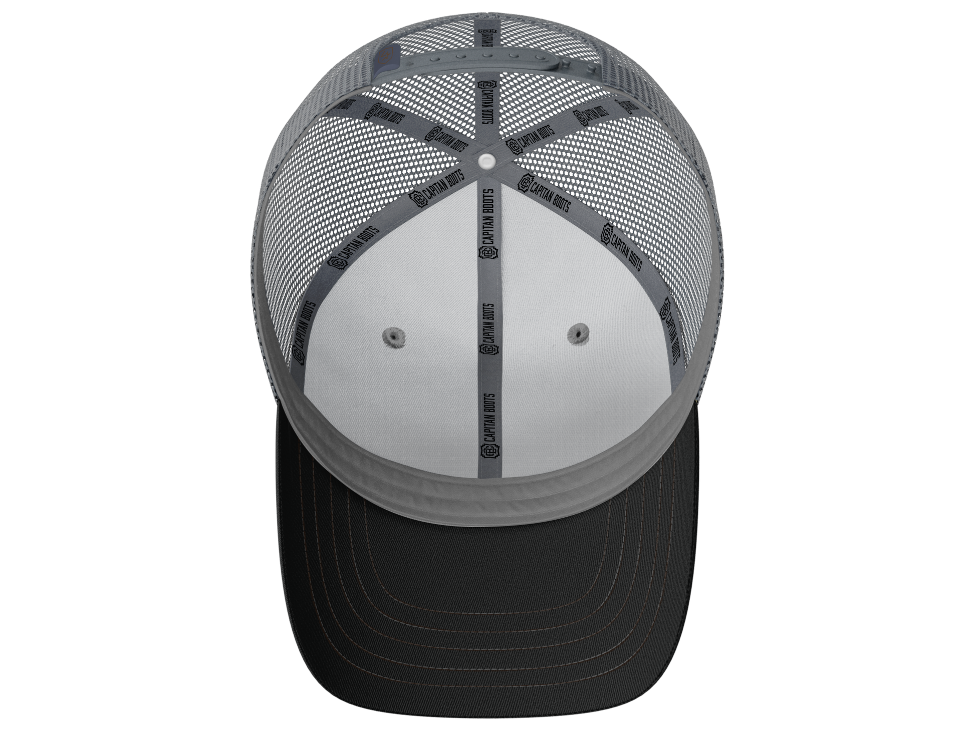 Capitan Boots 3D embroidered logo on a Coal and Ash mesh back trucker hat. Shade your eyes and look good doing it.