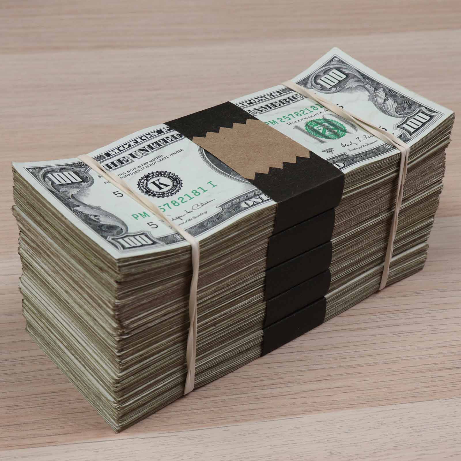 Our $50,000 1990 Series Aged Full Print Stacks Bundle is perfect for film, TV, advertising, music videos, and more. This bundle includes five hundred $100 1990 Series Aged Full Print bills for a total of $50,000. The non-glossy bills feature unmatched quality, realistic detail, and are each double sided. Plus, you'll get money bands and rubber bands. Get the closest look to real money without breaking the bank.