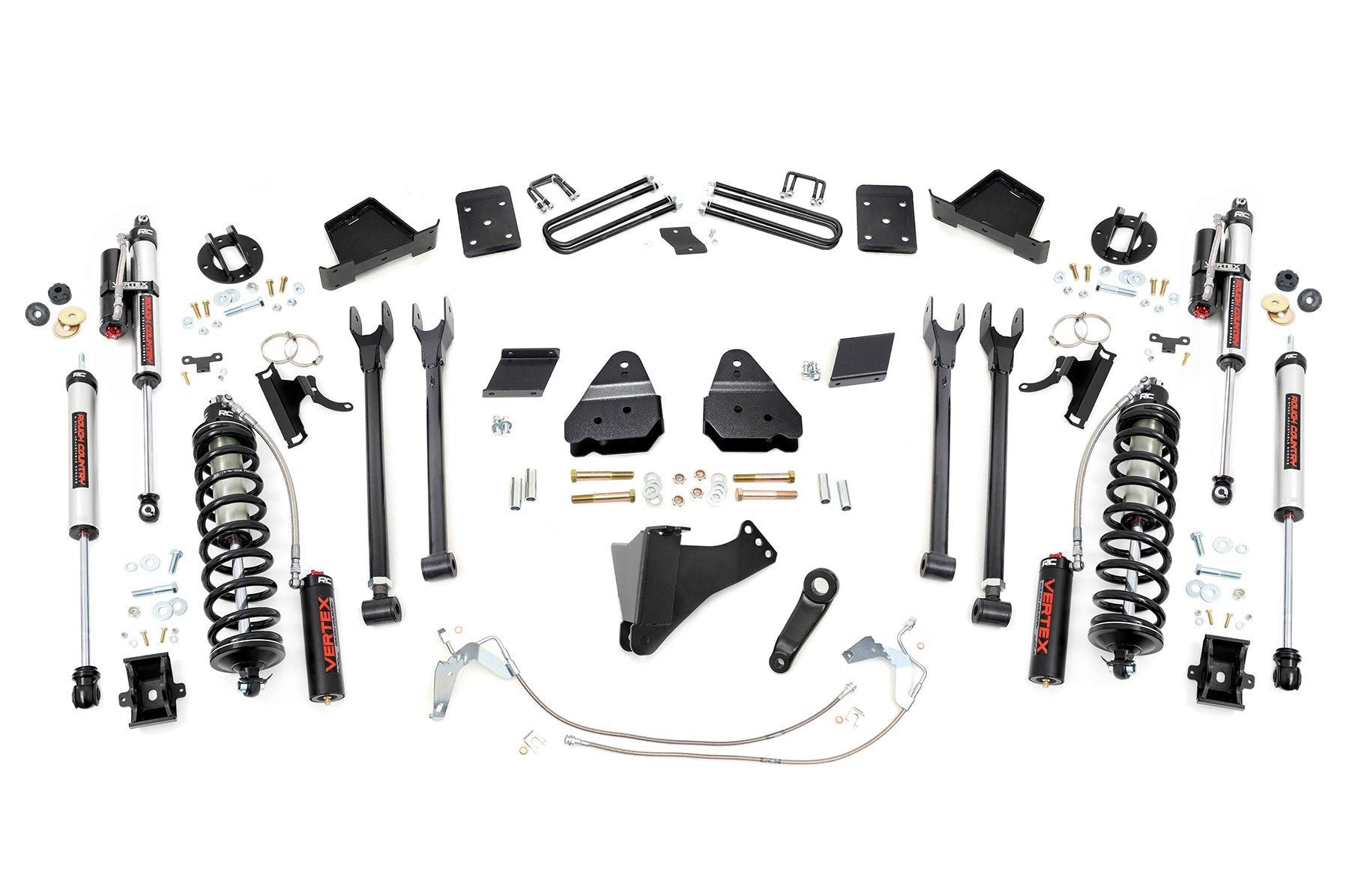 Superior Ride Quality. Give your third-generation Ford Super Duty an impressive upgrade and incredible ride quality with Rough CountryΓÇÖs 4-Link Coilover Conversion Lift Kit! This must-have kit is the pinnacle of suspension upgrades. Providing ride height adjustability, increased dampening, and killer good looks. You're sure to set yourself apart from the pack. This innovative kit allows you to replace your factory arms with a 4-Link setup, using Rough CountryΓÇÖs durable, fixed upper arms and adjustable lower control arms. A set of radius arm drop brackets maintain proper geometry and allow for proper caster setting, which is crucial to maintaining factory handling.\Durable Components. Rough CountryΓÇÖs 6" 4-Link Coilover Conversion Lift Kit features top-mounted reservoir brackets and coil-over mounts constructed from 1/4-inch steel. Utilizing this conversion kit you're removing the factory independent coil shock and coil set-up and replacing it with a massive 2.5in piston, nitrogen-charged, 8-stage adjustable Vertex Coilover. Rough CountryΓÇÖs Vertex Coilovers feature a monotube design with an external reservoir for increased oil capacity and damping sensitivity. When it comes to investing in a high-end kit, youΓÇÖll be pleased to find that Rough CountryΓÇÖs 2.5in piston design is beefier and offers an impressive 56% greater fluid capacity than the average reservoir shock. Each kit is paired with a monotube shock that provides optimal damping control.\Installation. Requiring cutting and drilling to install, an estimated timeframe of 6-10 hours is recommended to complete this full installation. This full kit can be installed at home and can be completed efficiently and quickly!\Limited Lifetime Replacement Warranty. Rough CountryΓÇÖs 4-Link Coilover Conversion Lift Kit is backed with a limited lifetime replacement warranty towards manufacturer defects. As such, the product is protected from structural and workmanship damage after the date of purchase. With our industry-leading warranty give yourself peace of mind when using Rough Country's Suspension products!