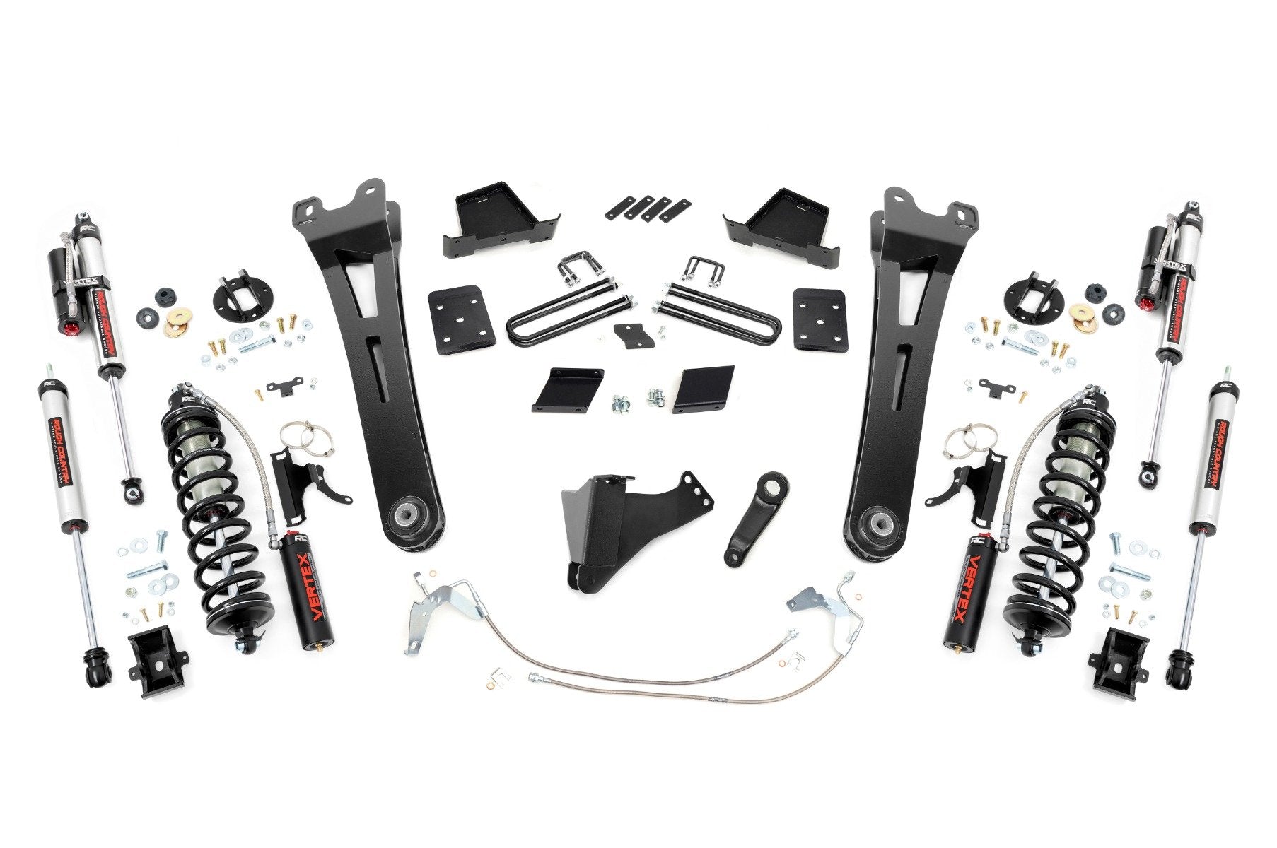 Superior Ride Quality. Take your third-generation Ford Super Duty to new heights with Rough Country's 6-inch Radius Arm Coilover Conversion Suspension Lift! This all-inclusive kit comes with everything you need for a total transformation of your truck. Run up to 37in tires while preserving the smooth, factory ride quality with this impressive upgrade. Durable Components. When changing a vehicle's suspension, the key to preserving ride quality is keeping the geometry of all suspension components as close to their factory angles as possible. Rough Country's new 6-inch Radius Arm Suspension Lift features a set of ultra-durable Radius Arms, precision fit to bolt right into the factory mounts for an easier install and a more factory-like angle. At 27lbs each, these beefy, upgraded Radius Arms dwarf stock equipment and feature durable durable rubber bushings for maximum vibration absorption. Rough CountryΓÇÖs 6" Radius Coilover Conversion Lift Kit features top-mounted reservoir brackets and coil-over mounts constructed from 1/4-inch steel. Utilizing this conversion kit you're removing the factory independent coil shock and coil set-up and replacing it with a massive 2.5in piston, nitrogen-charged, 8-stage adjustable Vertex Coilover. Rough CountryΓÇÖs Vertex Coilovers feature a monotube design with an external reservoir for increased oil capacity and damping sensitivity. When it comes to investing in a high-end kit, youΓÇÖll be pleased to find that Rough CountryΓÇÖs 2.5in piston design is beefier and offers an impressive 56% greater fluid capacity than the average reservoir shock. Each kit is paired with a monotube shock that provides optimal damping control. Installation. Requiring cutting and drilling to install, an estimated timeframe of 6-10 hours is recommended to complete this full installation. This full kit can be installed at home and can be completed efficiently and quickly! Limited Lifetime Replacement Warranty. Rough Country's 6-inch Radius Arm Coilover Conversion Suspension Lift Kit is backed with a limited lifetime replacement warranty towards manufacturer defects. As such, the product is protected from structural and workmanship damage after the date of purchase. With our industry-leading warranty give yourself peace of mind when using Rough Country's Suspension products!