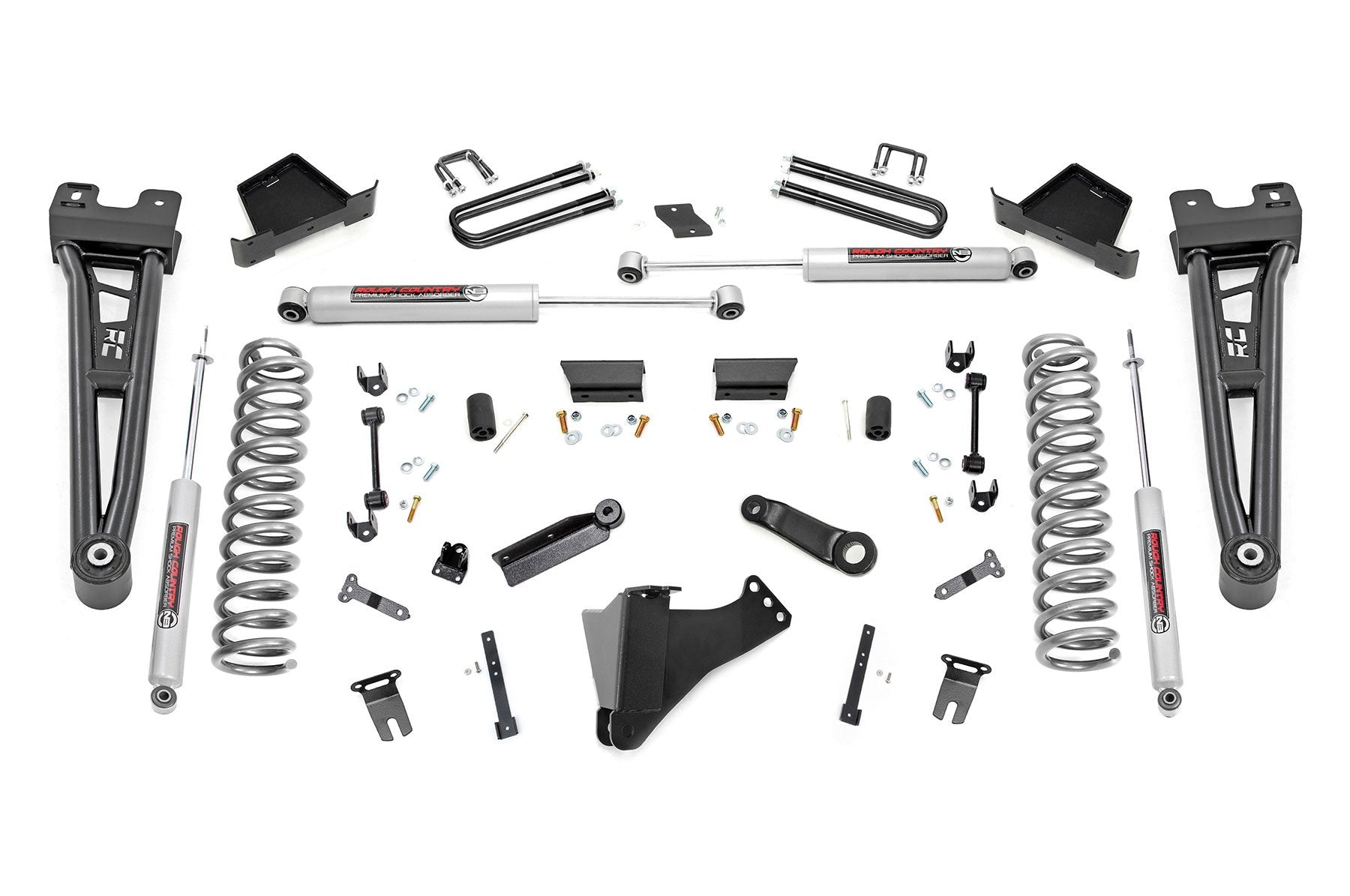 Superior Ride Quality. Take your fifth-generation Ford Super Duty to new heights with Rough Country's 6-inch Radius Arm Drop Suspension Lift! This all-inclusive kit comes with everything you need for a total transformation of your truck. Run up to 37in tires while preserving the smooth, factory ride quality with this impressive upgrade.\Durable Components. When changing a vehicle's suspension, the key to preserving ride quality is keeping the geometry of all suspension components as close to their factory angles as possible. Rough Country's new 6-inch Suspension Lift features a set of tubular radius arms, precision fit to bolt right into the factory mounts for an easier installation and a more factory-like angle. Fearing a massive 2" O.D. these beefy, upgraded radius arms dwarf stock equipment and feature durable rubber bushings for maximum vibration absorption.\Installation. Requiring cutting and drilling to install, an estimated timeframe of 6-10 hours is recommended to complete this full installation. This full kit can be installed at home and can be completed efficiently and quickly!\Limited Lifetime Replacement Warranty. Rough Country's 6-inch Suspension Lift Kit is backed with a limited lifetime replacement warranty towards manufacturer defects. As such, the product is protected from structural and workmanship damage after the date of purchase. With our industry-leading warranty give yourself peace of mind when using Rough Country's Suspension products!