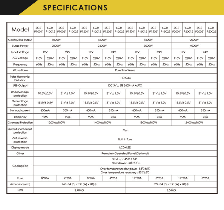 - 1500W continuous power, converting 12VDC to 120VAC Pure Sine Wave, and 2000W Peak power.