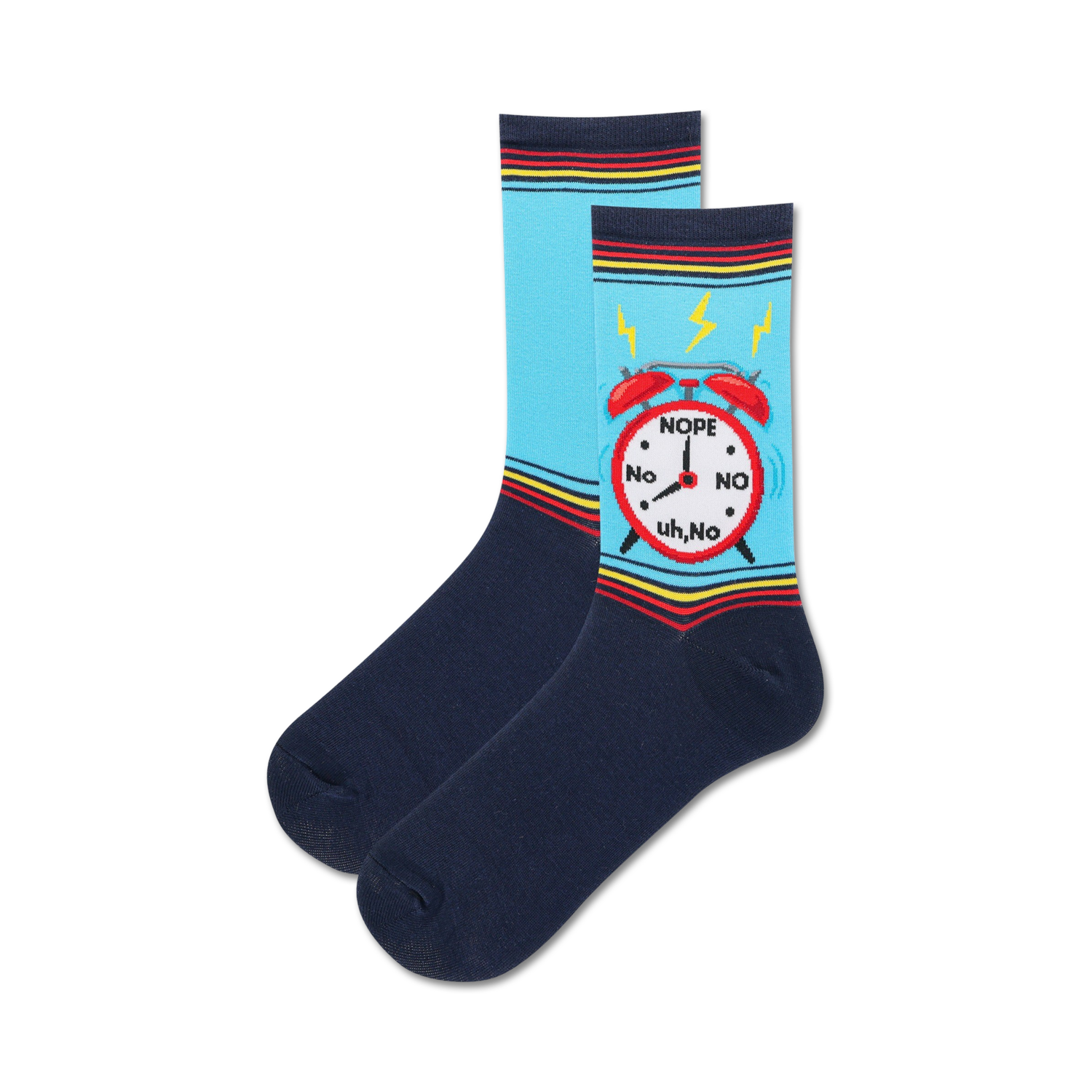 Shout a resounding “Nope!” to the morning alarm with these sassy blue crew socks. Adorned with ringing alarm clocks, complete with red bells and urgent yellow lightning bolts, these socks tell the world you're not having it today. The hands of each clock defiantly point to your mood manifesto: “No,” “Nope,” “Uh Uh.” Slip into these and let your feet do the talking when the early hours are calling.