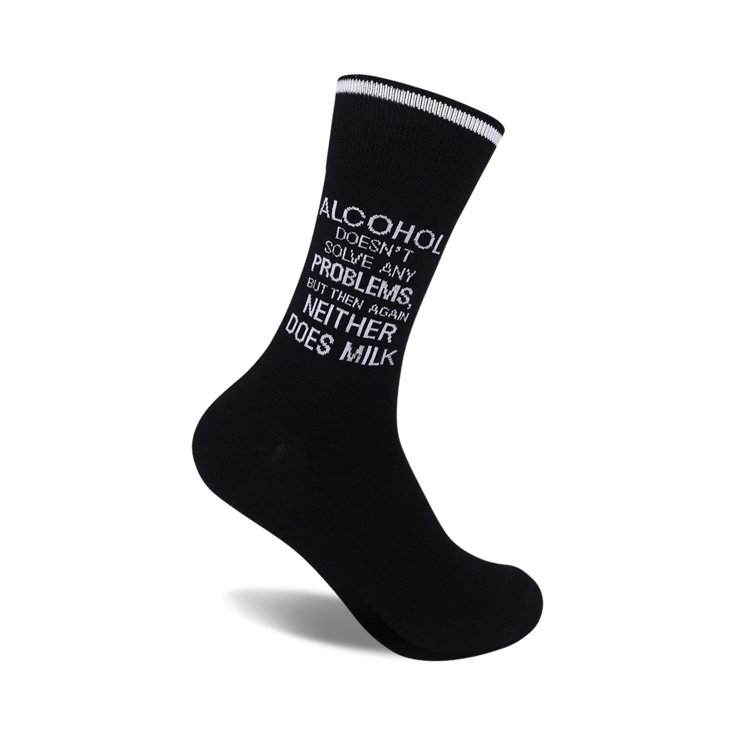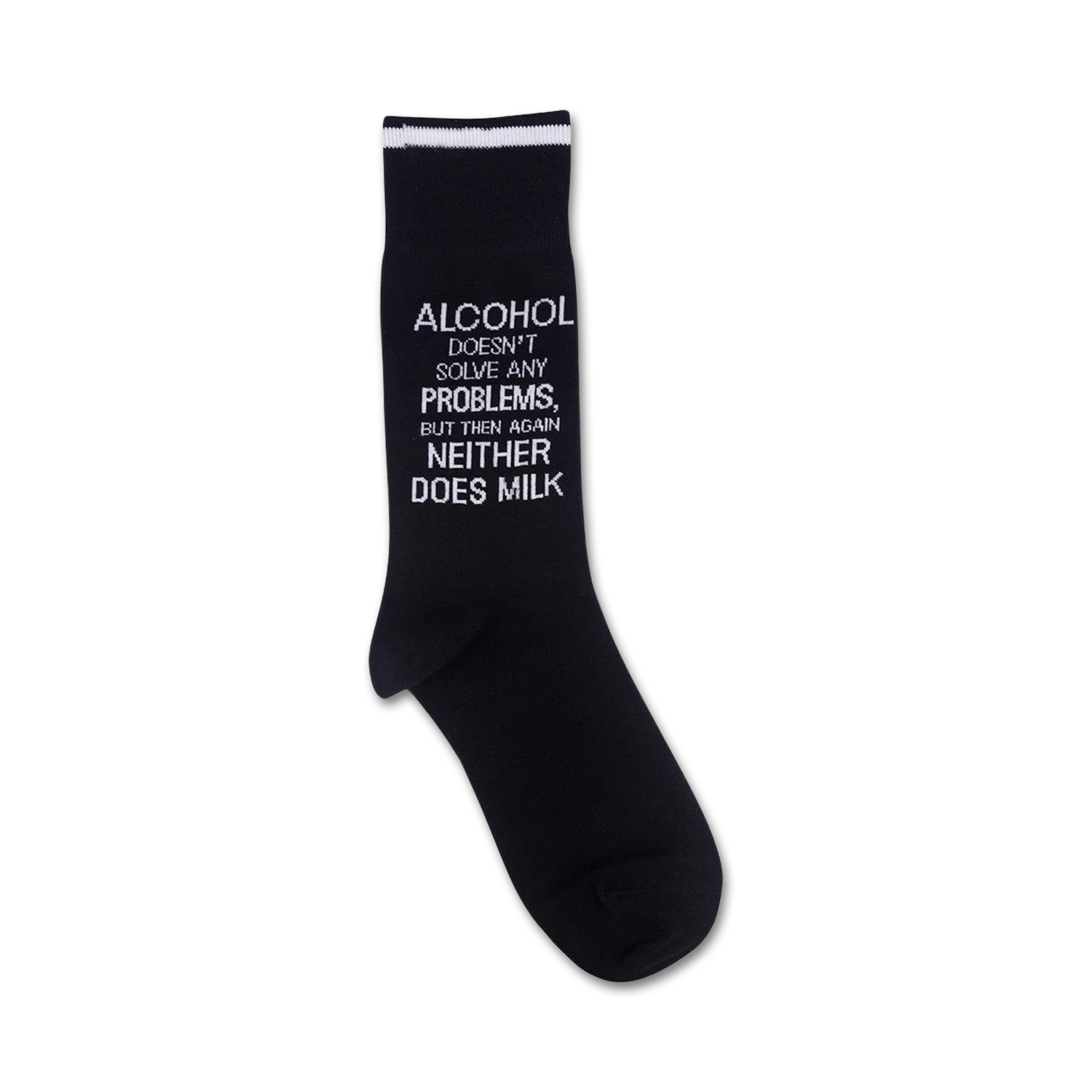 Black socks with white text that reads "Alcohol doesn't solve any problems, but then again neither does milk" - a tongue in cheek joke and memento that even the greatest beverages can't fix life's biggest problems. Designed to fit all people, these unisex, crew-length socks let you express your playful side while reminding you to enjoy life's little ironies.