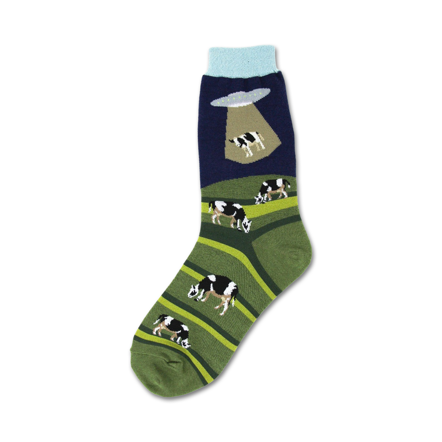 Sock it to 'em with our Alien Abduction socks! These calf-length cotton socks feature a dark blue background with a field of green grass, a spaceship in the top left corner, and a cow being abducted. They're perfect for anyone who loves aliens, cows, or just plain fun socks. Plus, they're made with ribbed cuffs for a snug fit.
