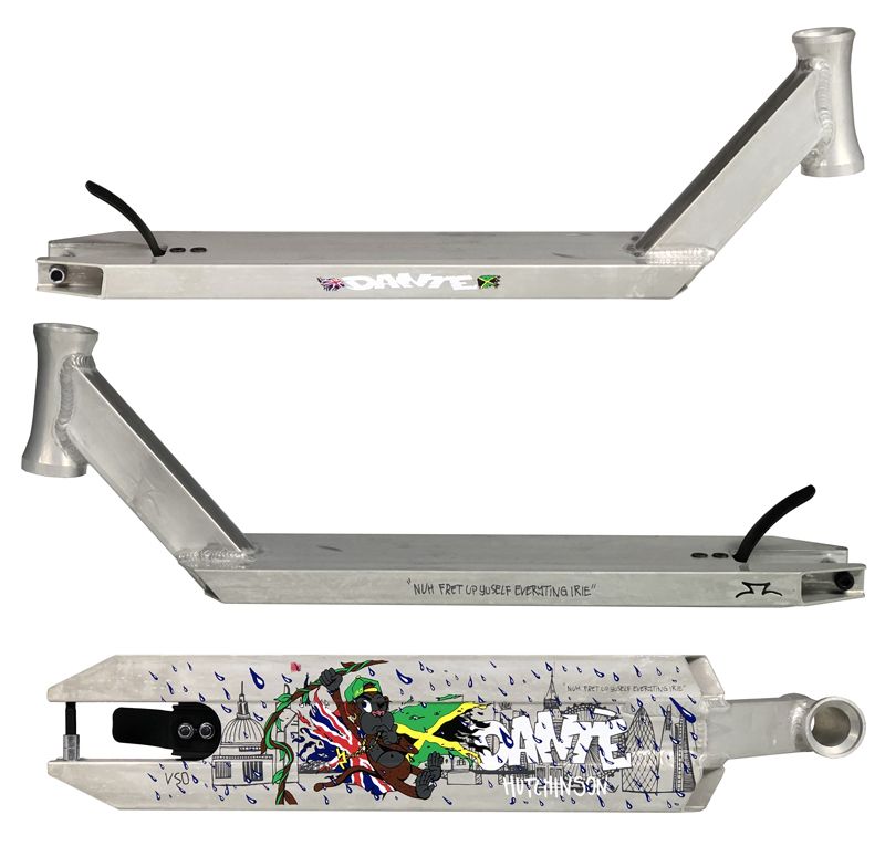 "Nuh fret up yuself everyting irie" - The Dante Hutchinson Signature deck is available now. Coming in at 4.6" wide x 19.5" long this deck is perfect for younger riders that are just starting out. Whether you're learning to ride at the park or out in the streets, the simple deck design allows it to be light weight but also extra strong for the wear & tear of Freestyle Scootering. Compatible for wheels up to 30 x 125 mm.