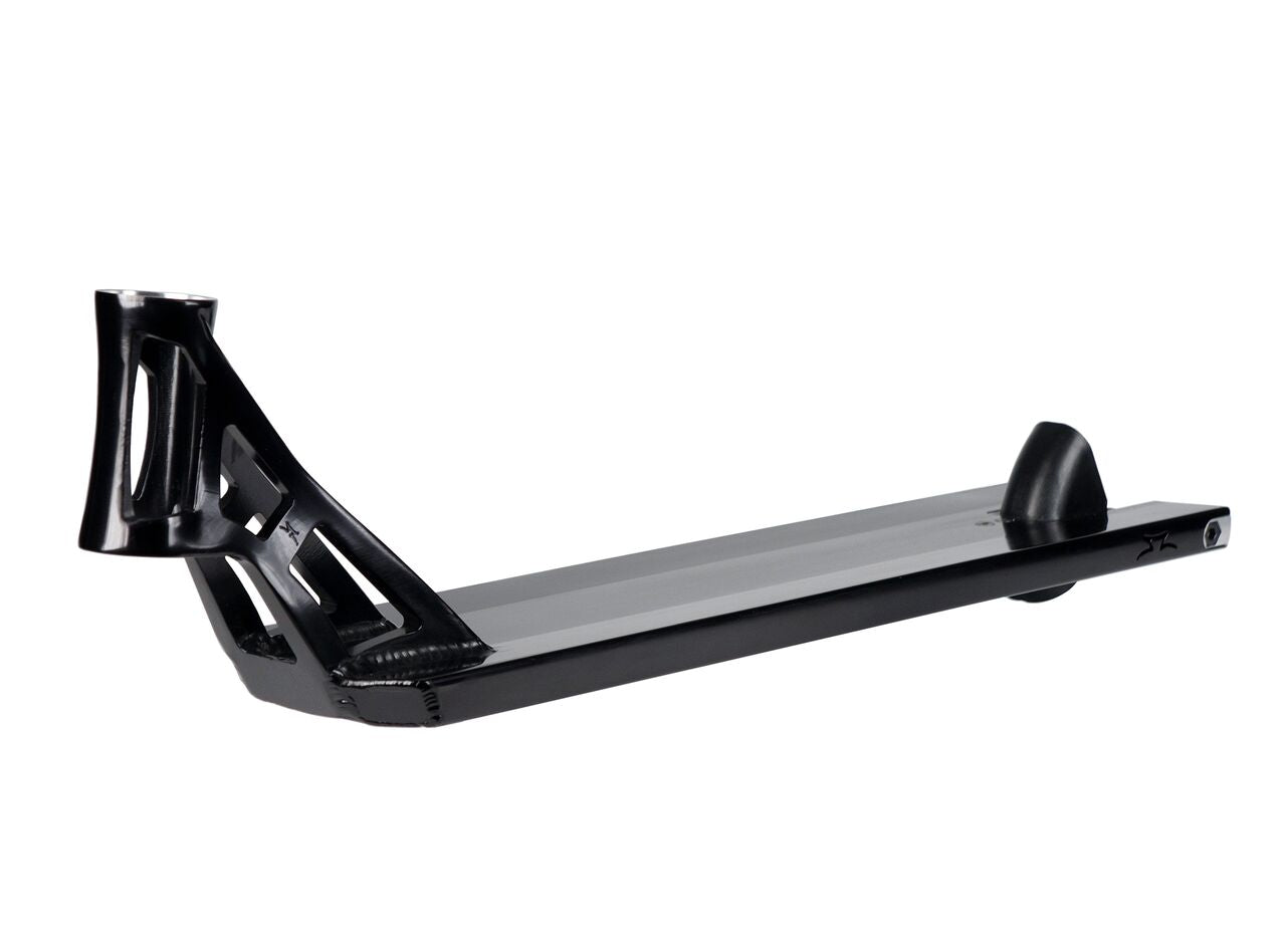 The S2 is 5.35” wide which provides for more control over your deck and a more comfortable ride. Near indestructible aluminum drop outs allow for more precise 5-0 grinds and hold the back axle snuggly in place. The deck is 3mm thinner which is a major improvement in the way you feel your deck. The thoroughly reinforced headtube comes with a 84 degree headtube angle which lets you lock and sit inside of noseblunts and crooks/overcrooks. Despite is large size of 23” the deck is surprisingly light but exceptionally strong and has been tested by some of our heaviest hitting riders for over 6 months without damage or even bending. It’s also very evenly weighted and you feel like you’re sitting right in the middle of the deck.