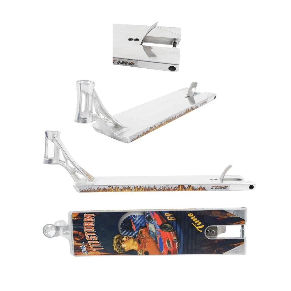 Gentlemen start your engines, the new Timo Sturmlin signature deck has arrived. Timo's deck features a new headtube design that allows for maximum foot space and increased noseblunt/crook room. Available in two widths, 5.8 wide x 21.5" and 22" long and 4.8" wide x 20.5" long, with the 5.8” deck coming with aluminum plugs for true boxed ends. This deck is also 12 STD / 30 x 125 mm wheel compatible with an optional axle/spacer conversion kit.
