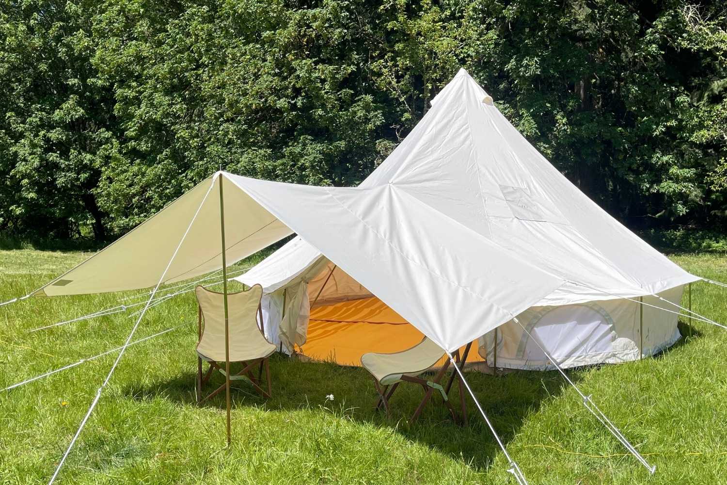 Add a shade and rain shelter to the front door of your bell tent with our canvas bell tent awning. Made from the same durable 11.5 oz canvas as our tents, this waterproof bell tent canopy is a simple way to extend the footprint of your tent. The added space can be used to keep camp gear dry, to escape from the sun, or for another location to place a sleeping cot.