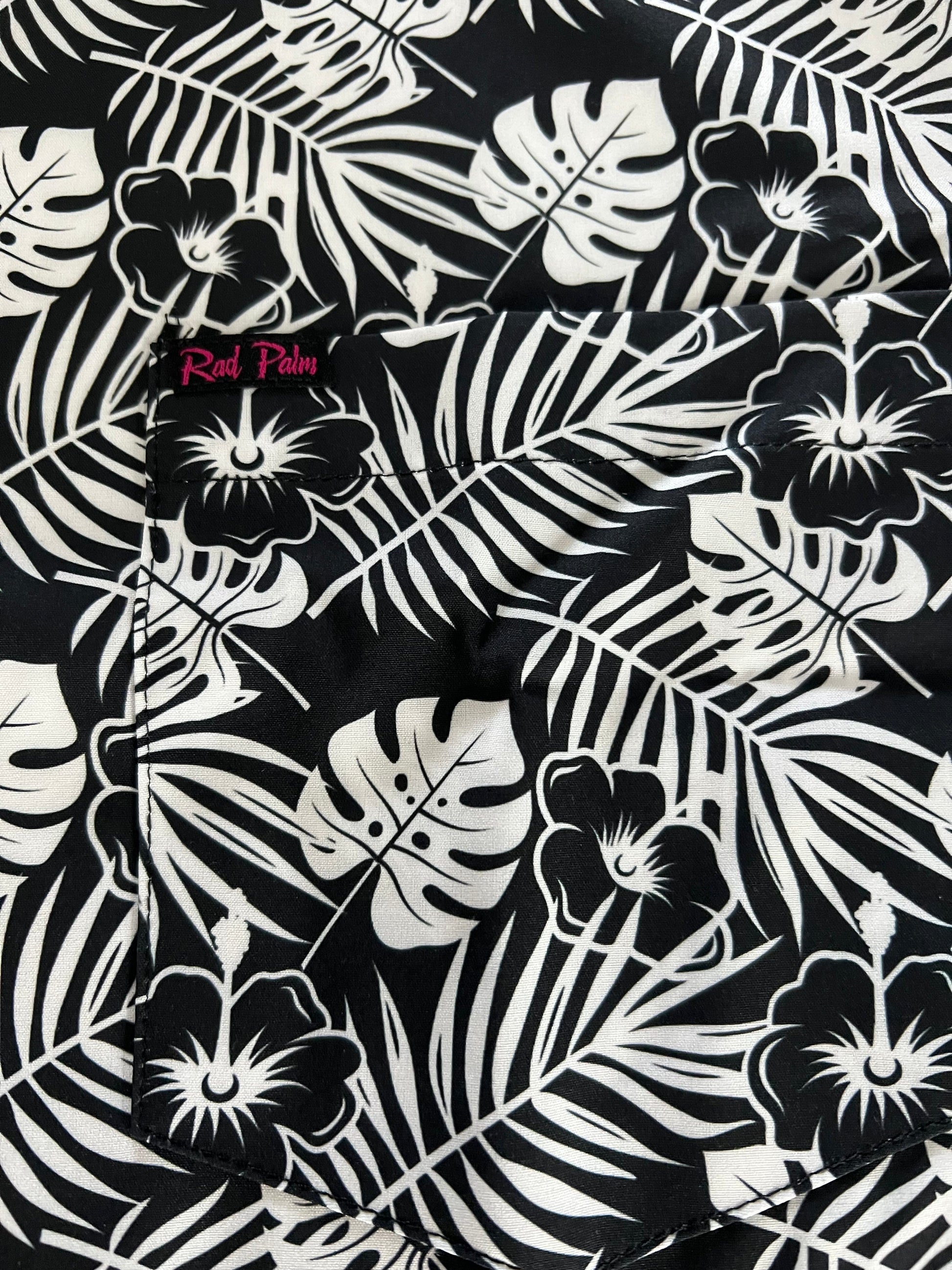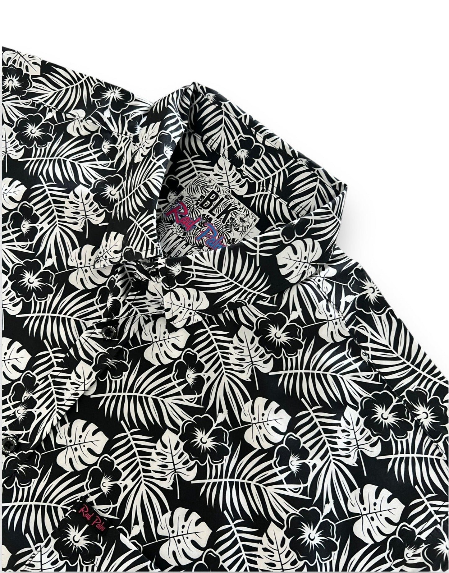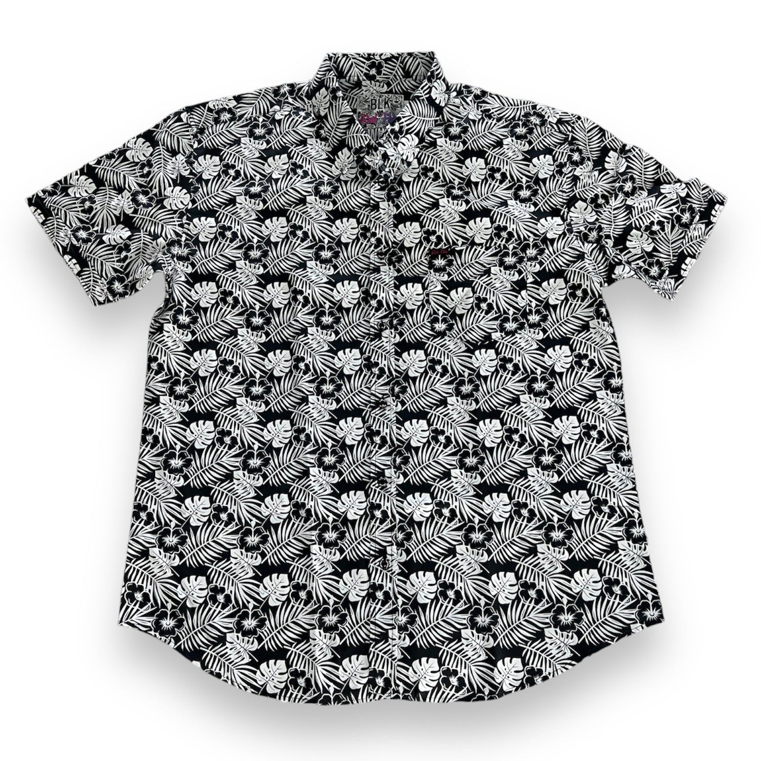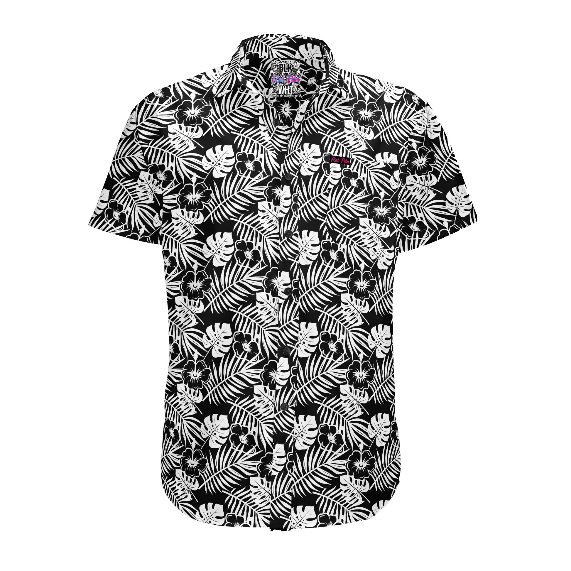Introducing the BLK WHT tropical short sleeve button-down shirt, an epitome of classic elegance with a contemporary twist. This black and white marvel seamlessly blends timeless sophistication with a tropical essence. Crafted with meticulous attention to detail, it boasts exquisite engraved buttons that add a touch of refinement. Embracing individuality, the shirt comes adorned with custom labeling, reflecting a commitment to quality and style. Its fabric composition, comprising 93% polyester and 7% spandex, ensures a comfortable and flattering fit. Whether strolling along sandy beaches or embracing a casual yet refined look, the BLK WHT shirt is an ideal choice for those seeking sartorial excellence with a tropical allure.
