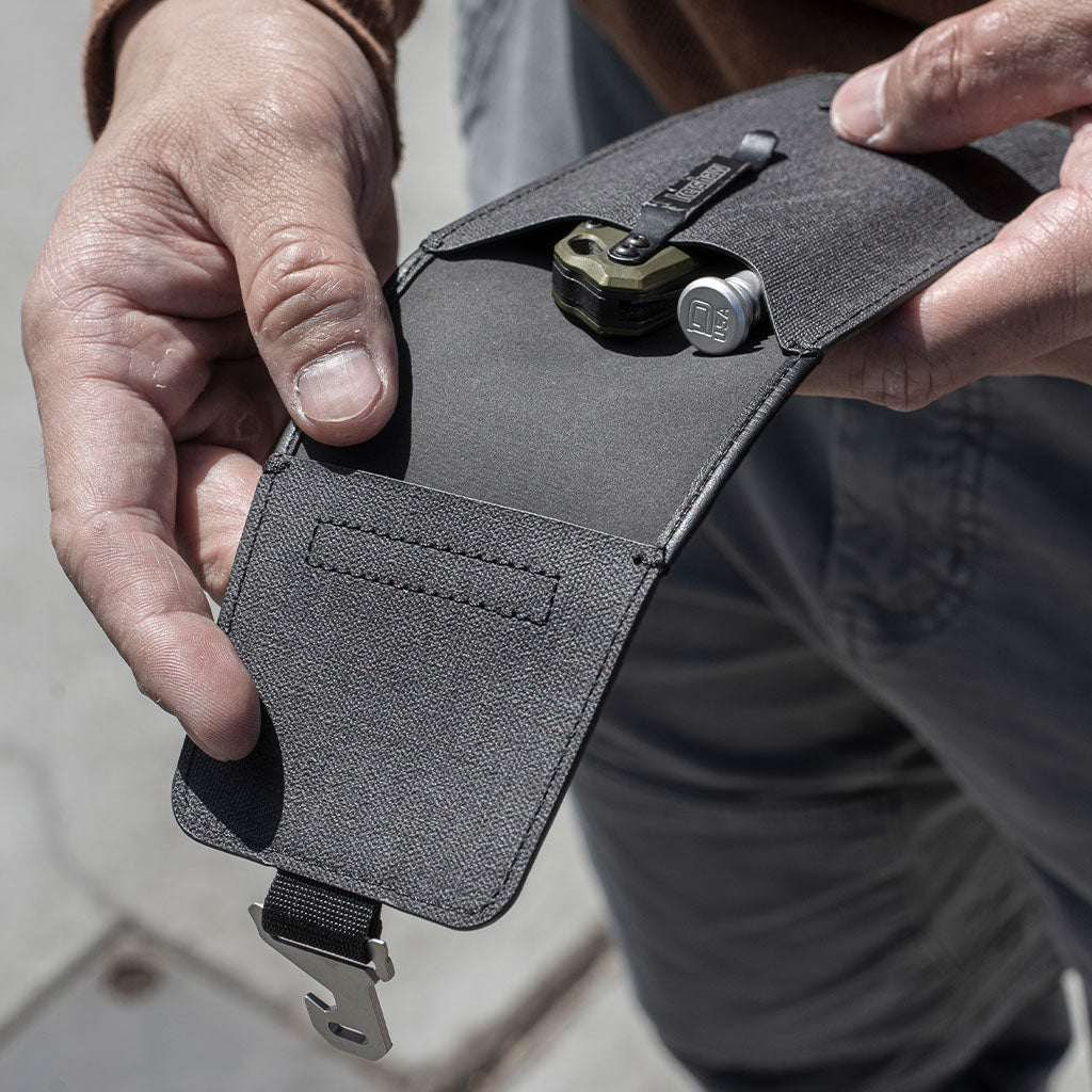 Made of water resistant DTEX material and secured by the MT01 Clasp & slot, the CA02 delivers comfort and durability. The CA02 is equipped with two inner pockets, one large pocket and one small velcro pocket for micro carry. In addition, a large through slot in the back allows the pouch to also function as a holster for belts and straps.