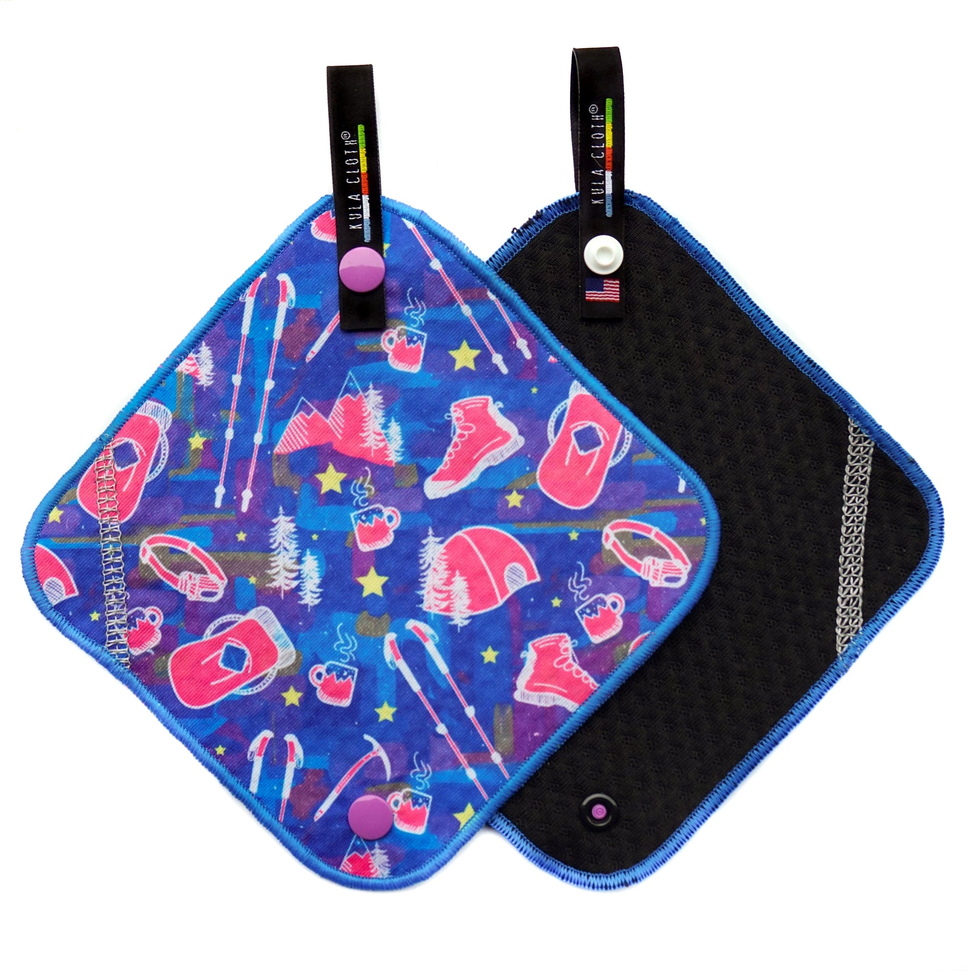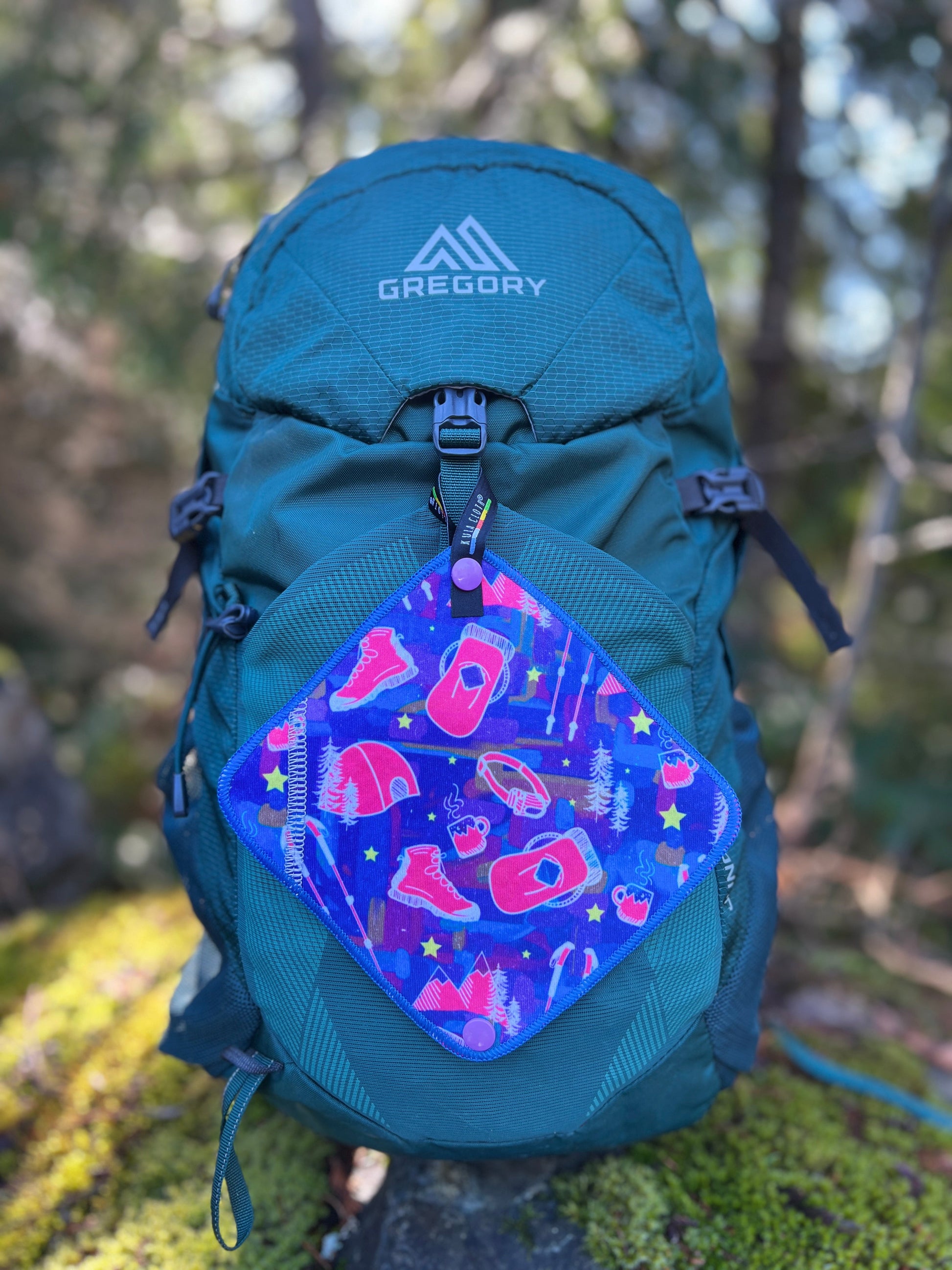 - 'double snap' allows cloth to hang while folded in half (so it doesn't touch pack and/or get dirty on the trail)