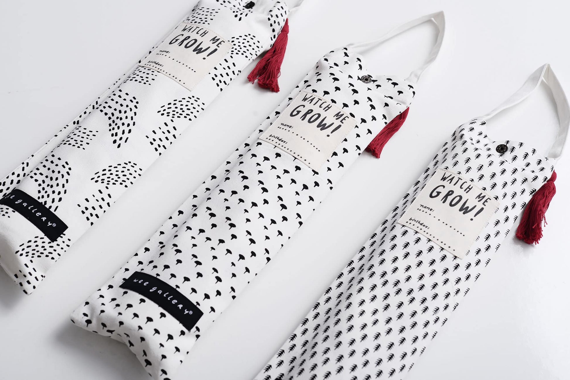 Ethically made in India using screen printing for quality, on 100% organic cotton canvas, finished with a waxed cotton twine hanging cord and stylish fringe end. Comes in a special keepsake storage bag with a place for your child's name and birth date. The most eco friendly gifts are the ones that are kept, and this measuring chart is made to be loved and to last.