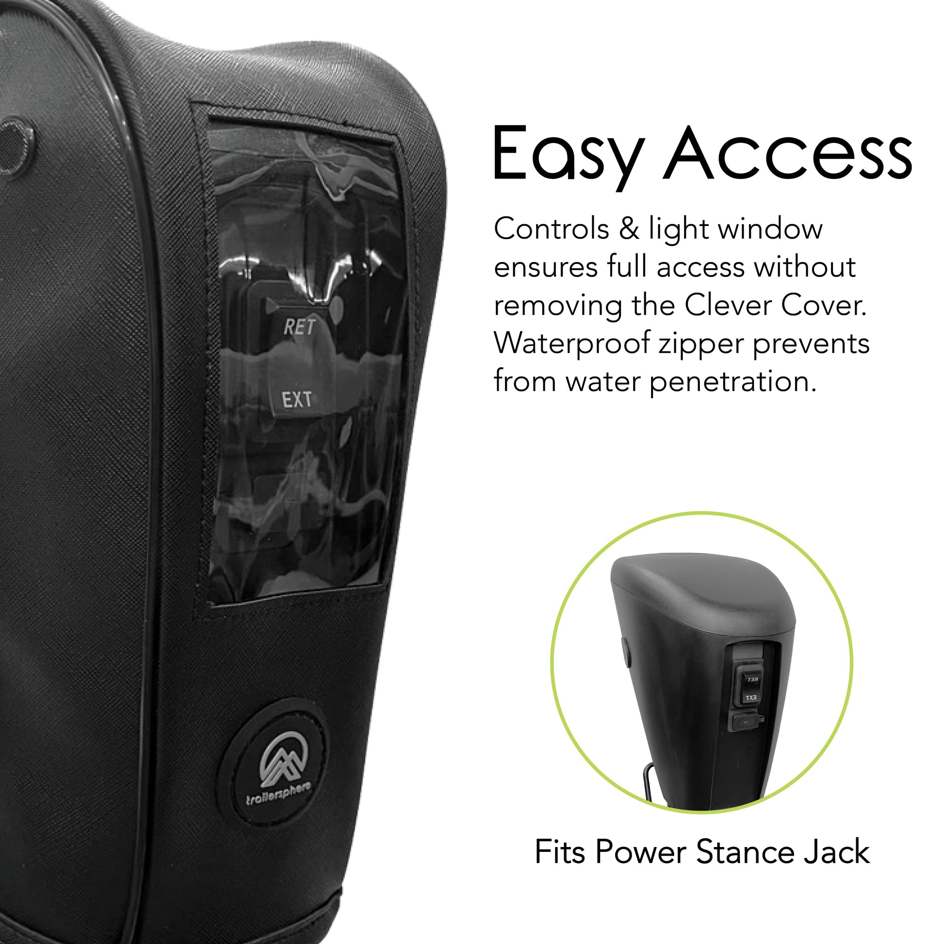 The safety chain hooks keep the chains off the ground and prevents them from rusting and getting dirty. While driving, simply use the snap buttons to secure the hooks to the cover. The 7-pin plug protects the power plug from the elements when disconnected from the vehicle, while the controls and light window ensures full access without removing the cover. The clever cover lock and reflective strips secure the cover to the jack to discourage theft with a lock grommet to provide security opportunities and the reflective strips offer greater visibility at night. A side waterproof zipper provides easy placements of the Clever Cover. Soft inner fabric provides scratch protection and strong outer fabric provides weather resistant protection and air vents allow the cover to breathe, creating an effective home for your jack.