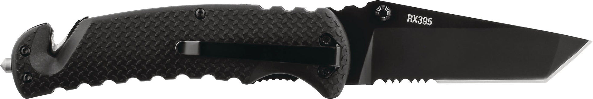 The RX395 is the optimal rescue tool for professionals and casual users alike. Using our Blade Assist Technology, the RX395 Knife is incredibly fast and easy to open so you can get to work on whatever task is at hand. It combines a liner lock with our Max Lock System to make sure you can comfortably use your knife without it accidentally closing or even opening in your pocket. It also has a textured nylon handle and stainless steel frame with a deep-carry pocket clip. For added safety, the RX395 comes equipped with a seat belt cutter and a glass breaker.