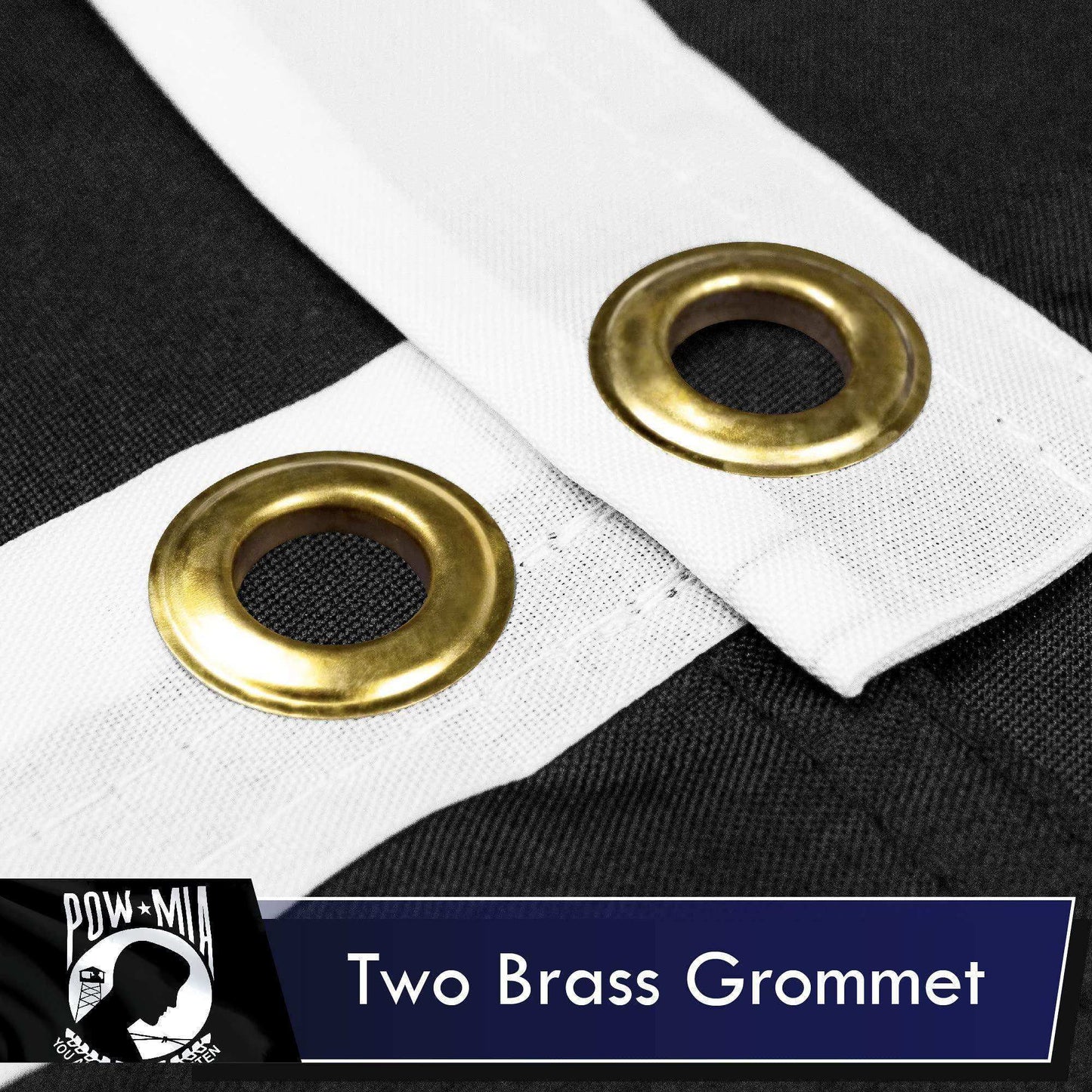 Fly ends are secured with FOUR rows of lock stitching to prevent ripping and tearing. Heavy duty polyester canvas heading with two strong solid brass grommets for easy hanging and display.
