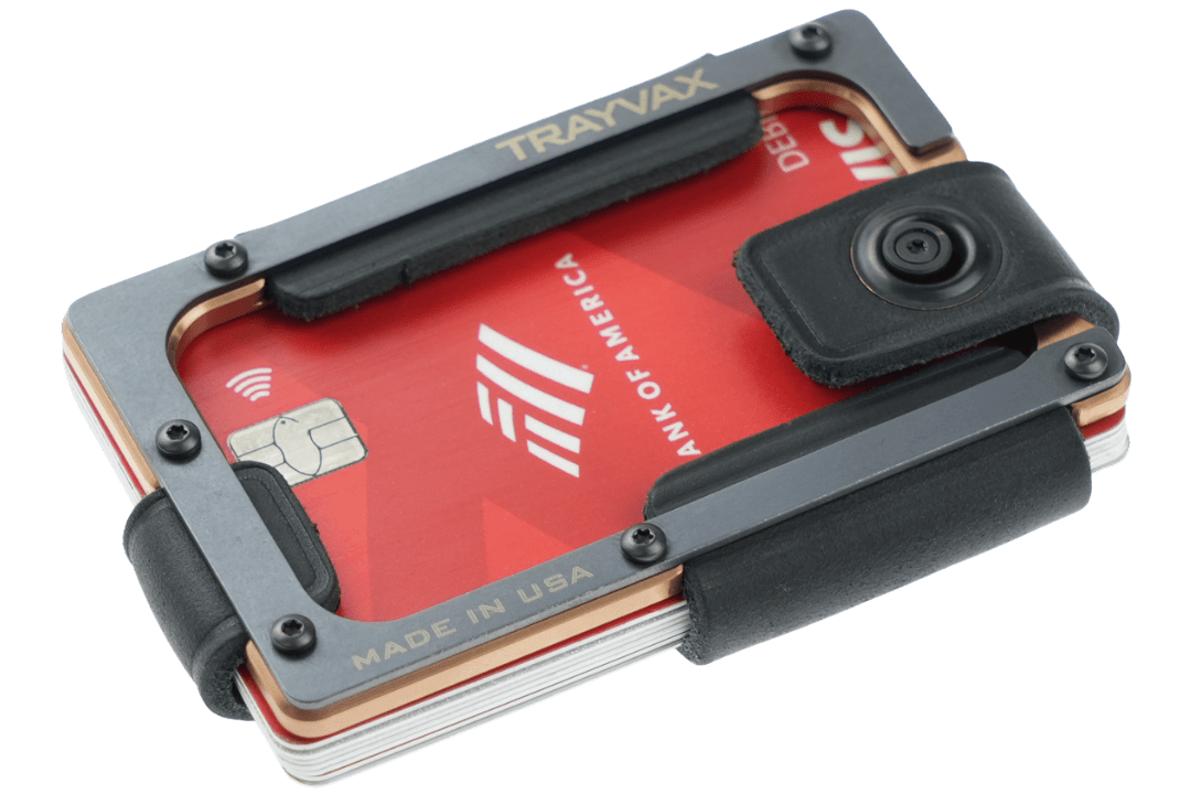 The Trayvax Contour is our most refined leather wallet to date. The bottom plate is highly-precise CNC-machined stainless steel. The top plate is PVD-coated for durability. Each plate is wrapped in top-grain oil-tanned leather, which will develop a patina as a constant reminder of your journey. Ideal for use as a front-pocket wallet, the sleek design and slim profile ensure a compact and lightweight everyday carry.