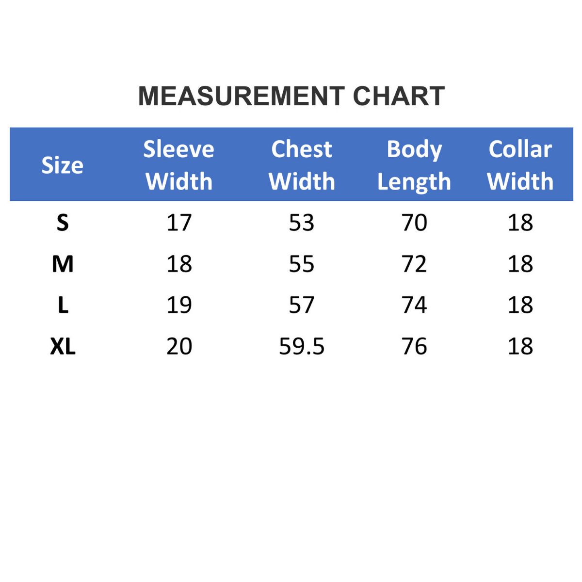 Size | Sleeve Width | Chest Width | Body Length | Collar Width |