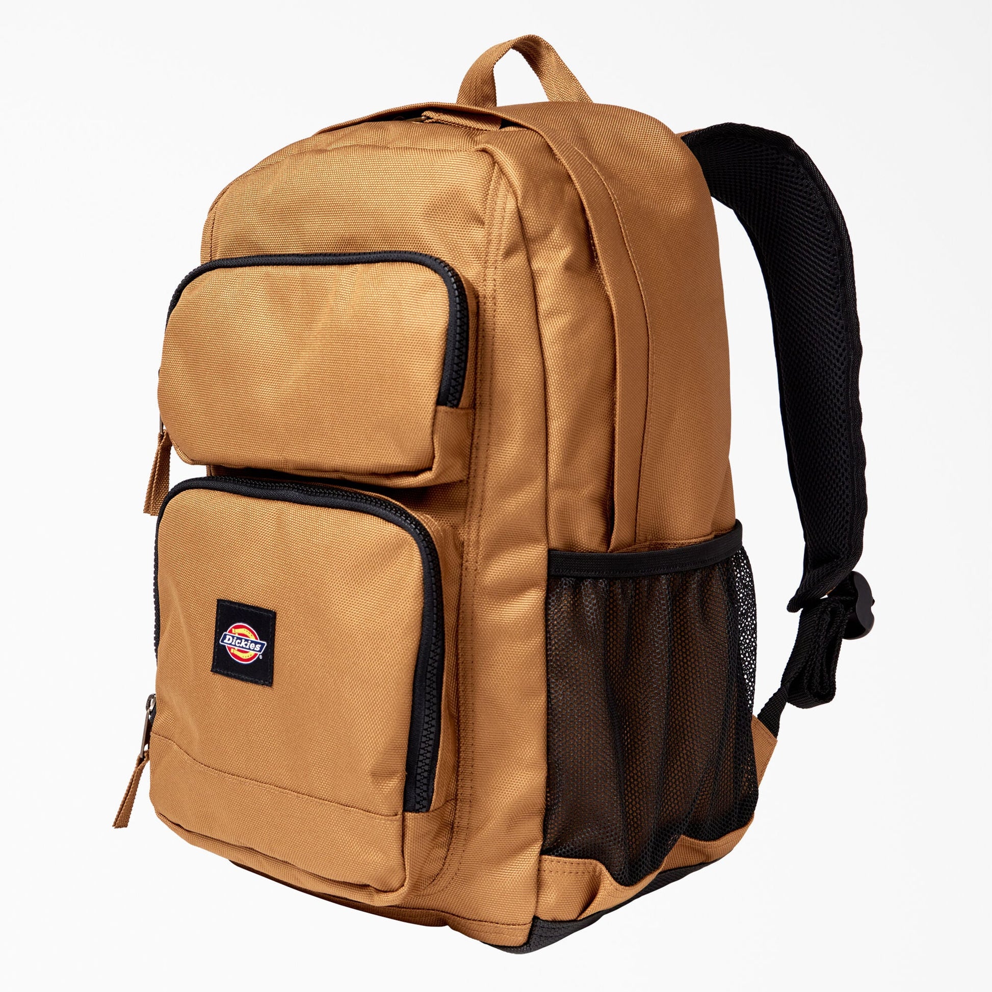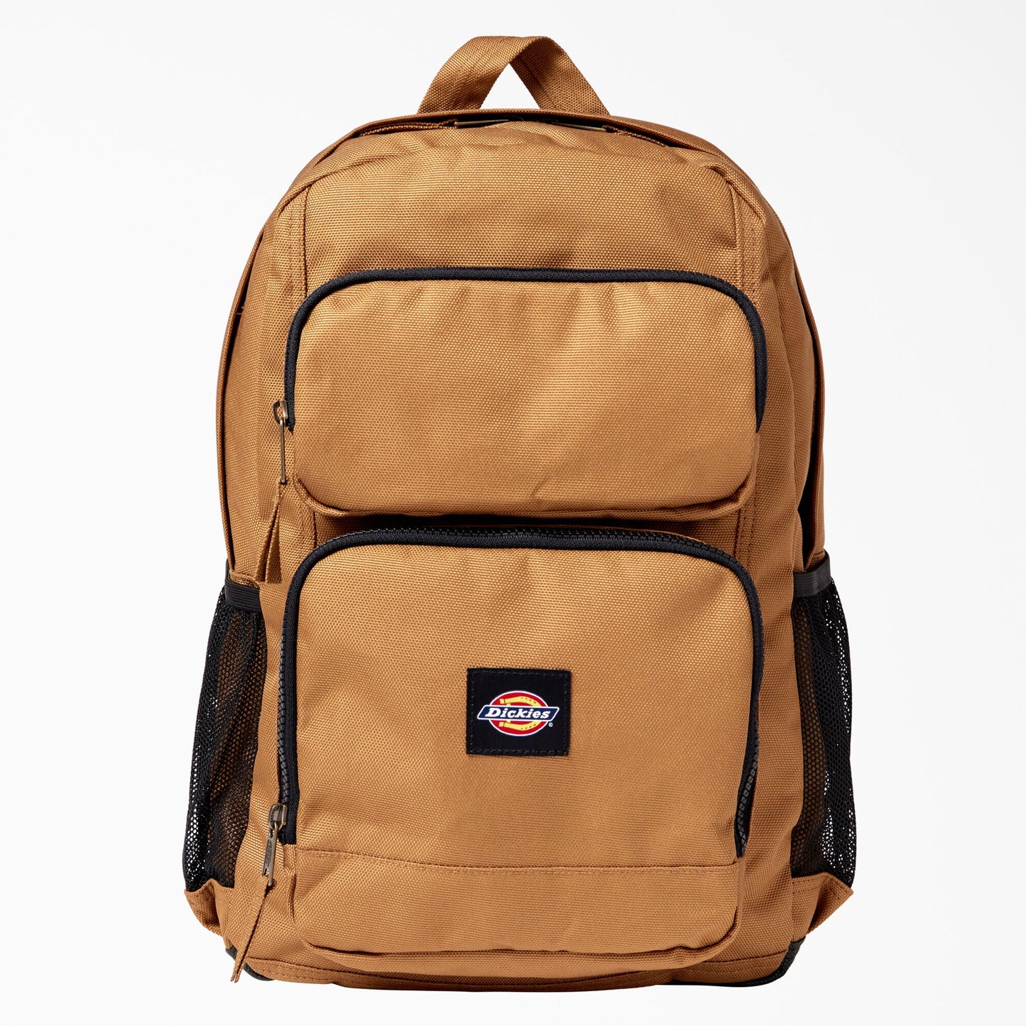 The double pocket backpack features a large main compartment with a padded internal laptop sleeve for secure storage. It also includes two front zip pockets and multiple interior pockets in varying sizes to organize smaller items like pencils, a phone, and a wallet. Additionally, it has two side water bottle pockets for easy access to hydration.