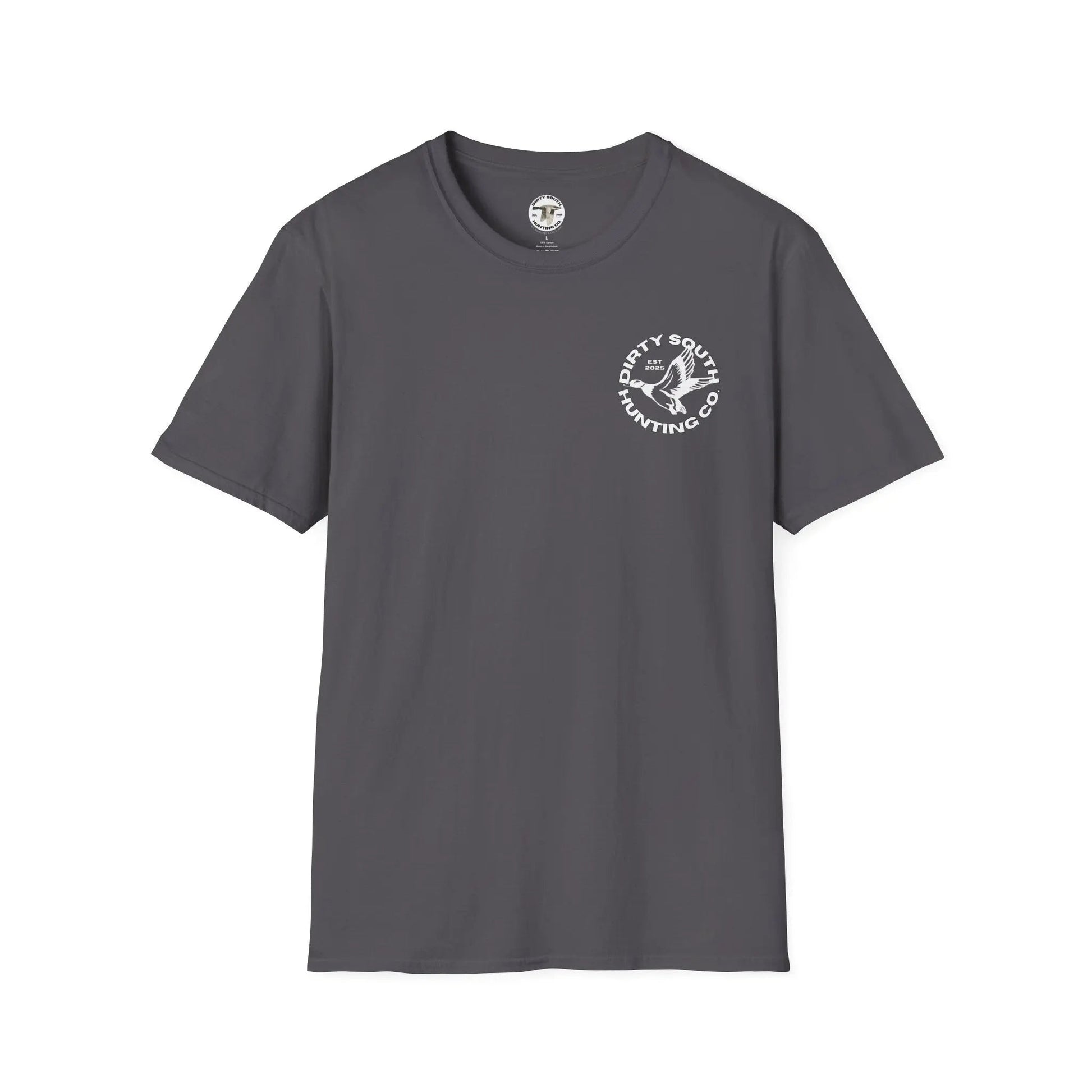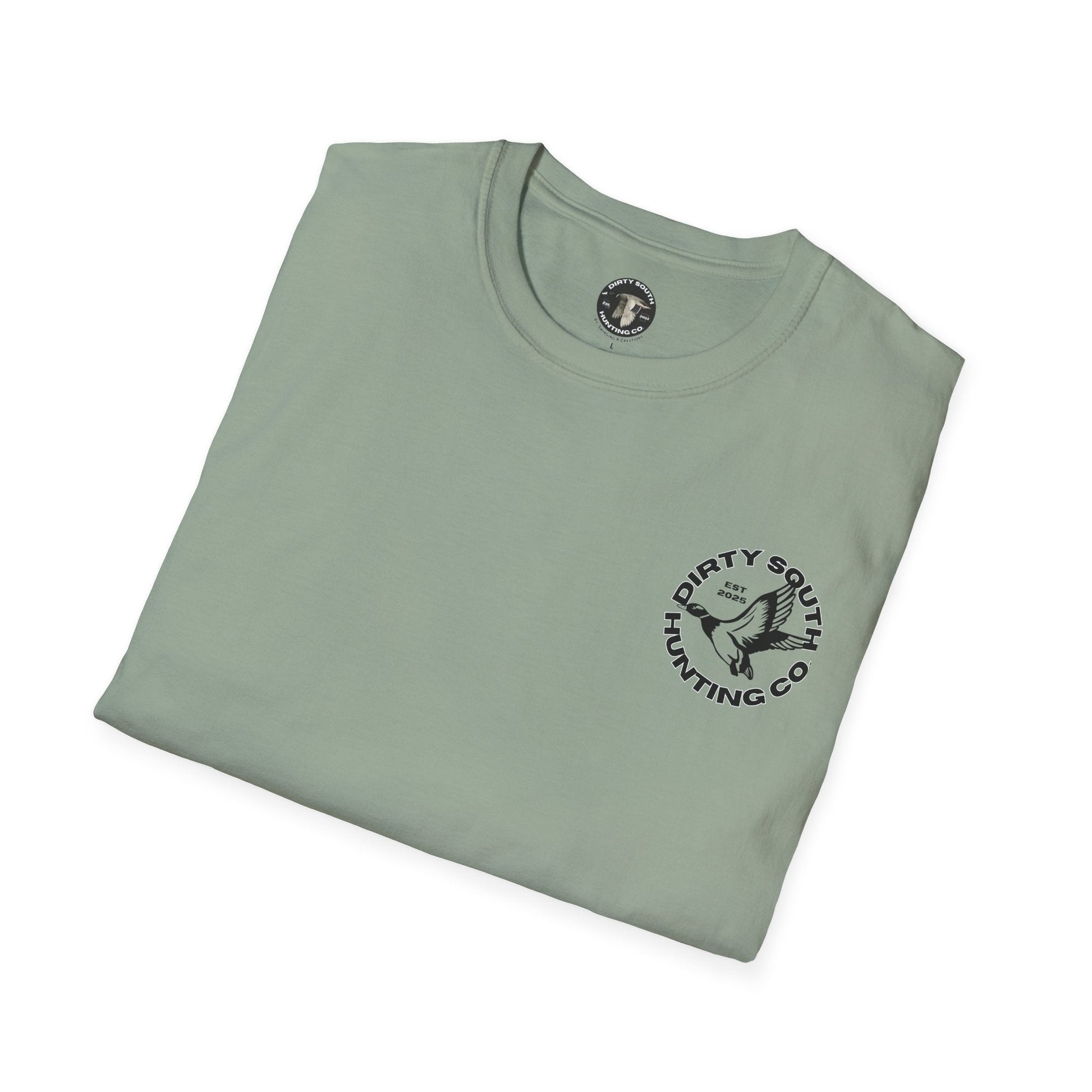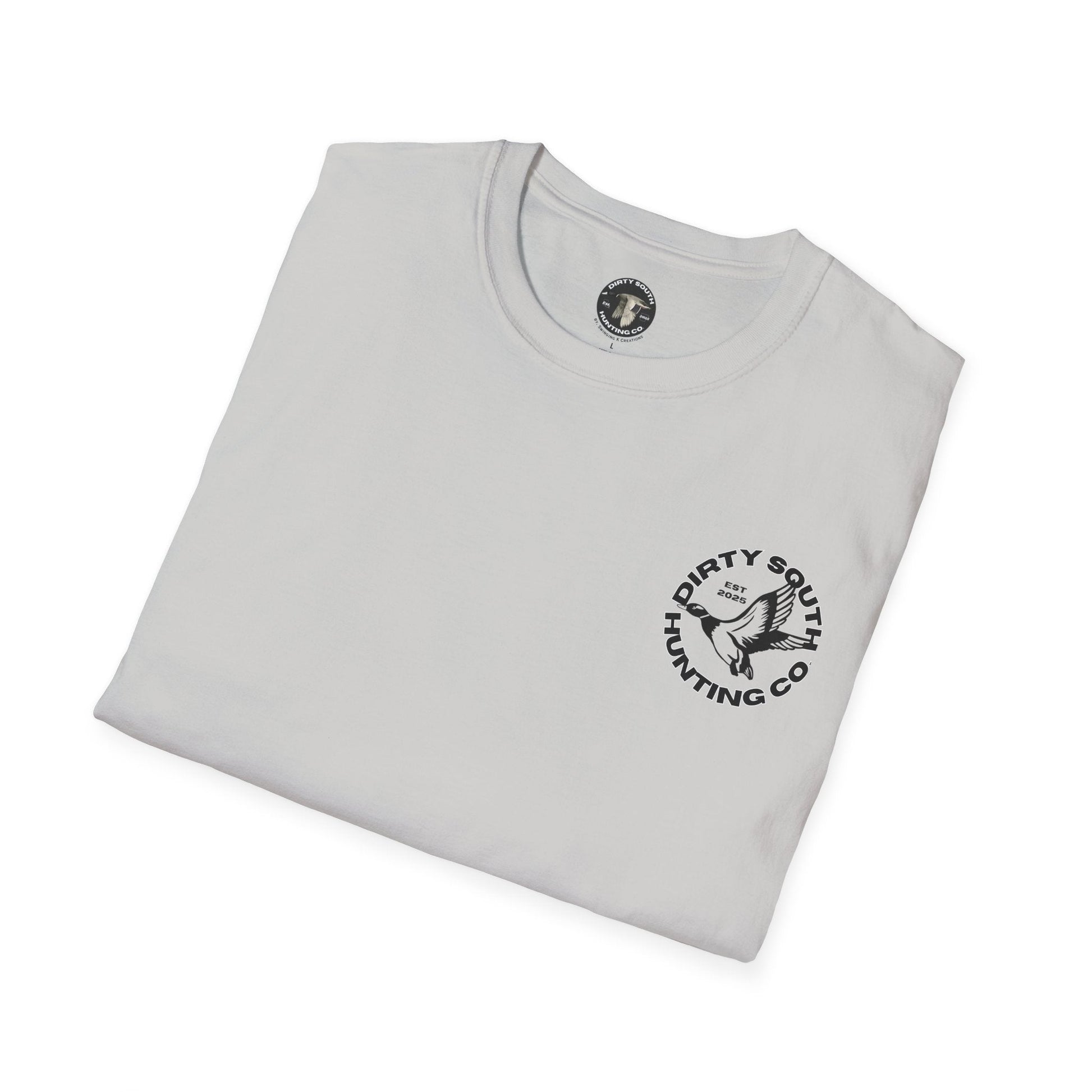 Soft lifestyle tee with a bold back graphic—mallards & shotguns wrapped in a vintage beer-can badge.
