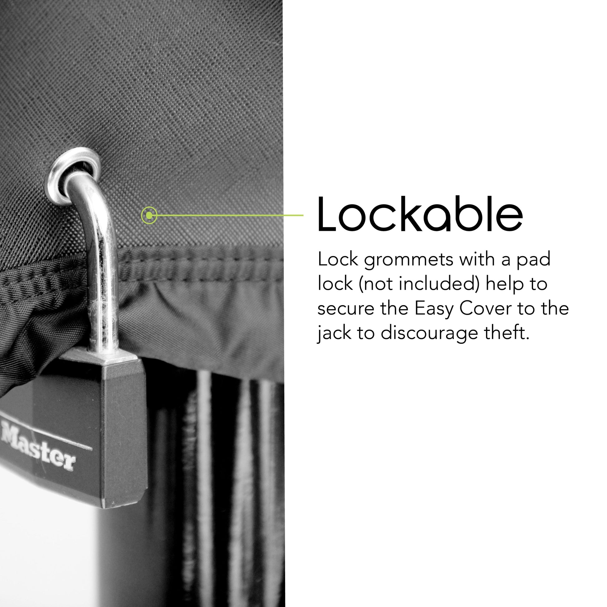 A universal jack cover that is actually designed and tested to protect the jack while staying secured to the jack when driving. All while, protecting your tongue jack from dirt, harsh elements and the weather. Lock grommet provides security opportunities and glow in the dark strips provide easy visibility at all times. Soft inner fabric provides scratch protection and strong outer fabric provides weather resistant protection and air vents allows the cover to breath, creating an effective home for your jack