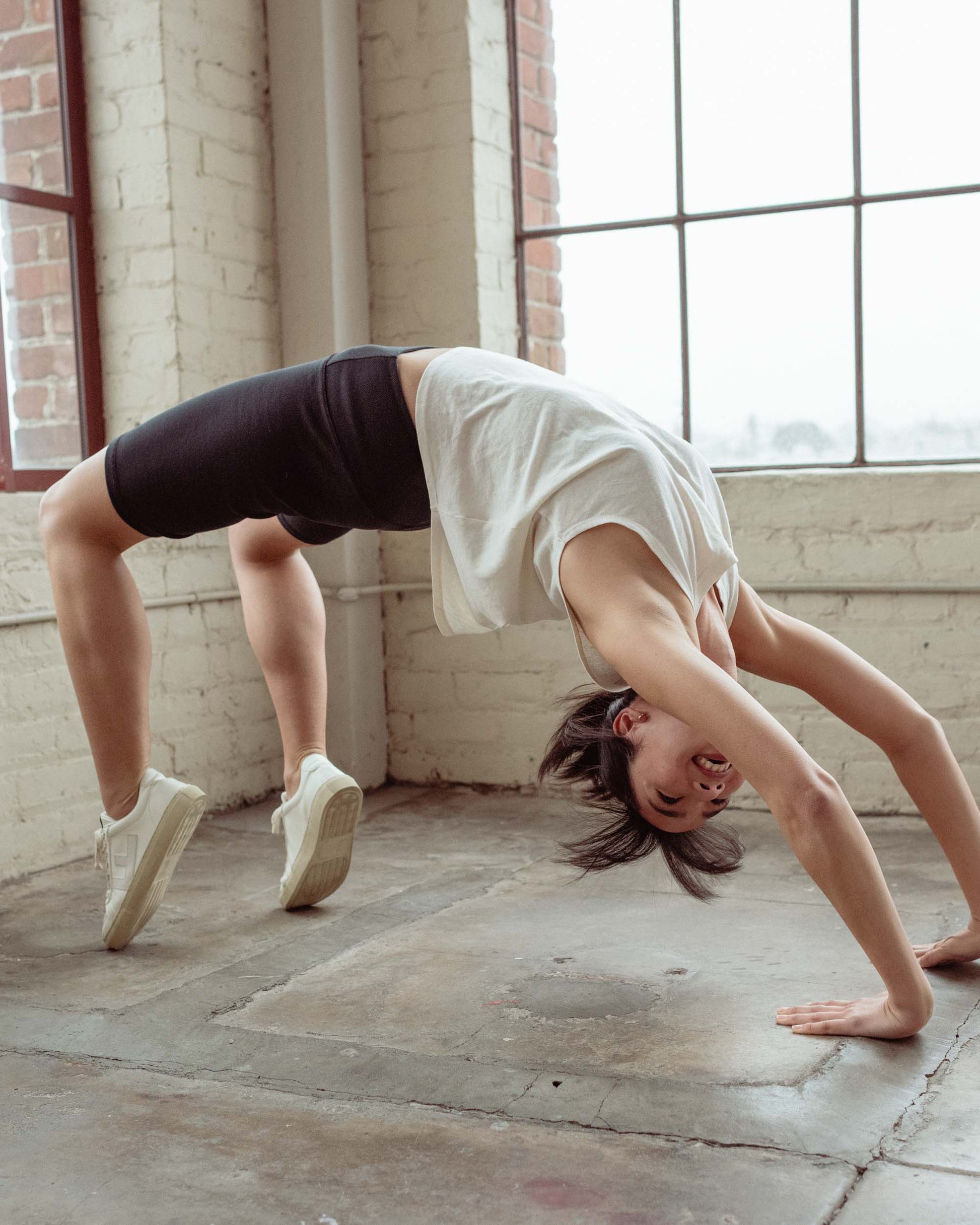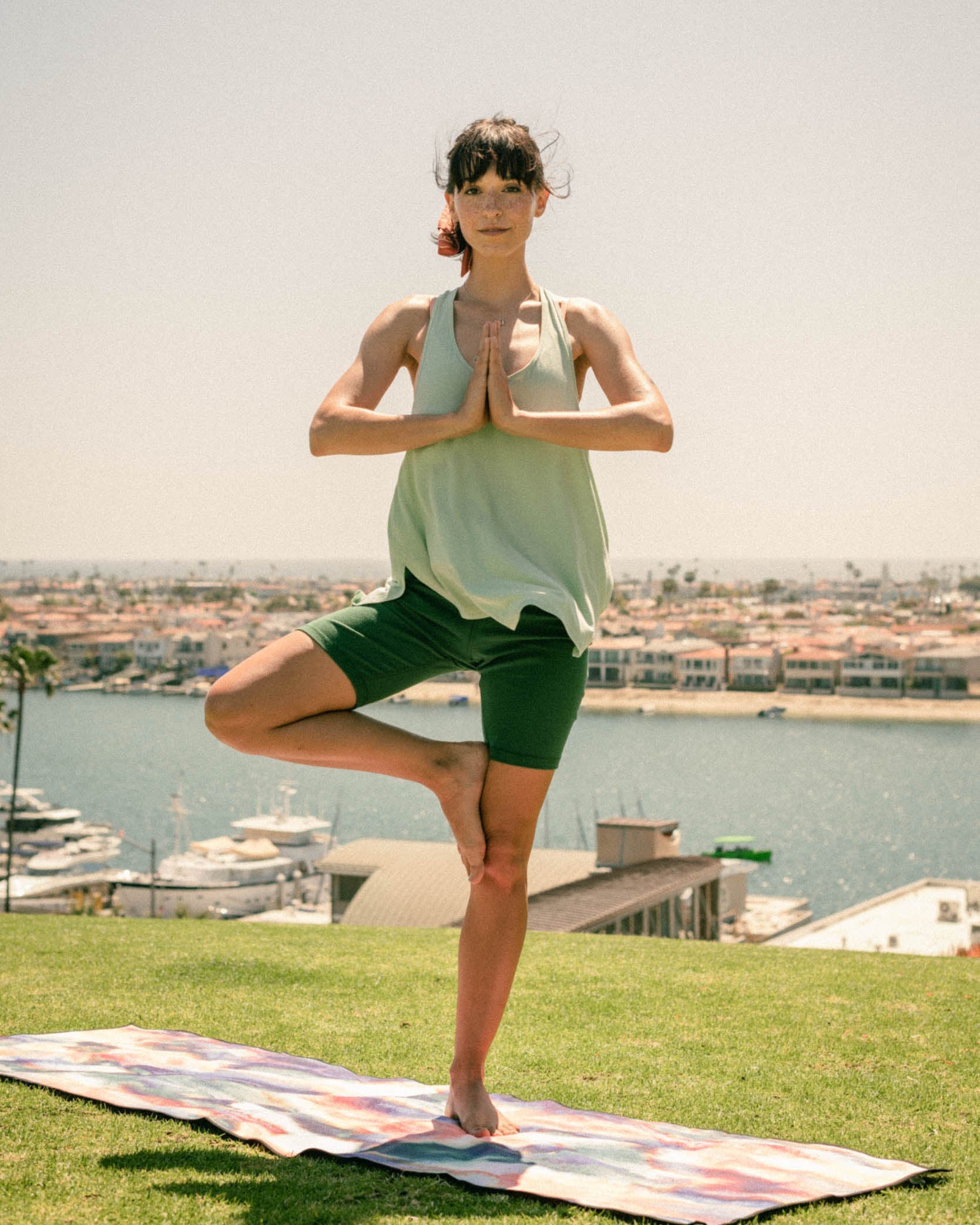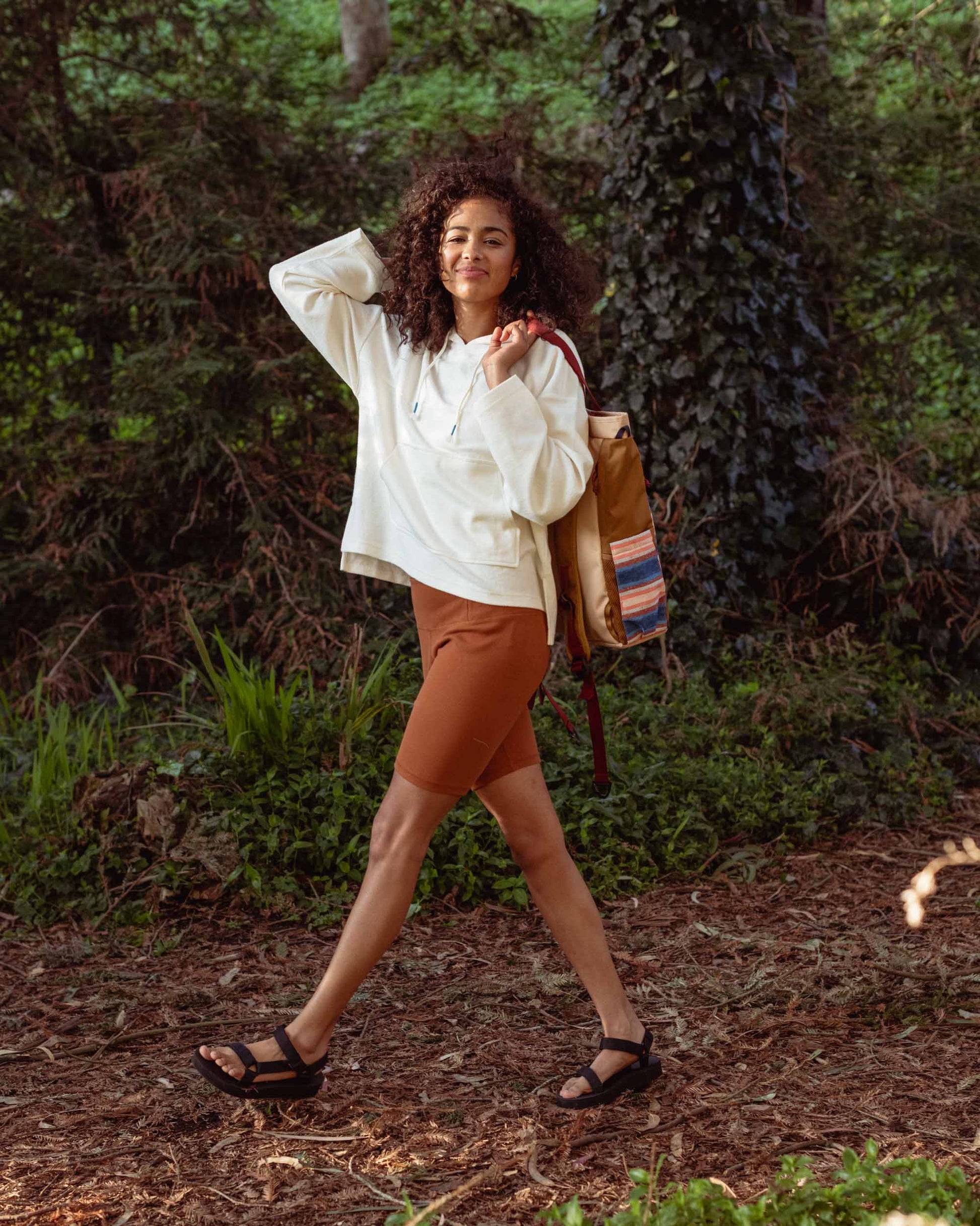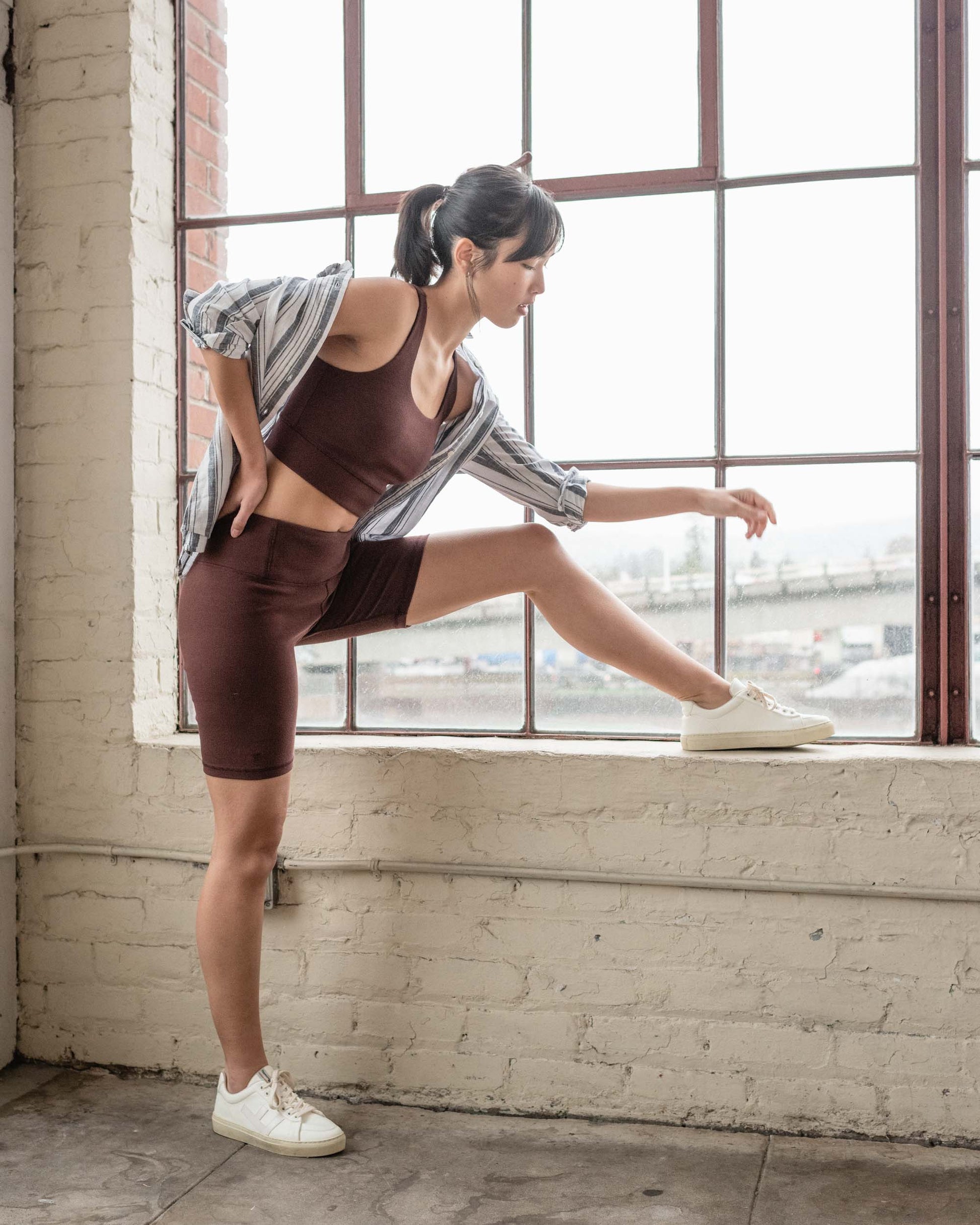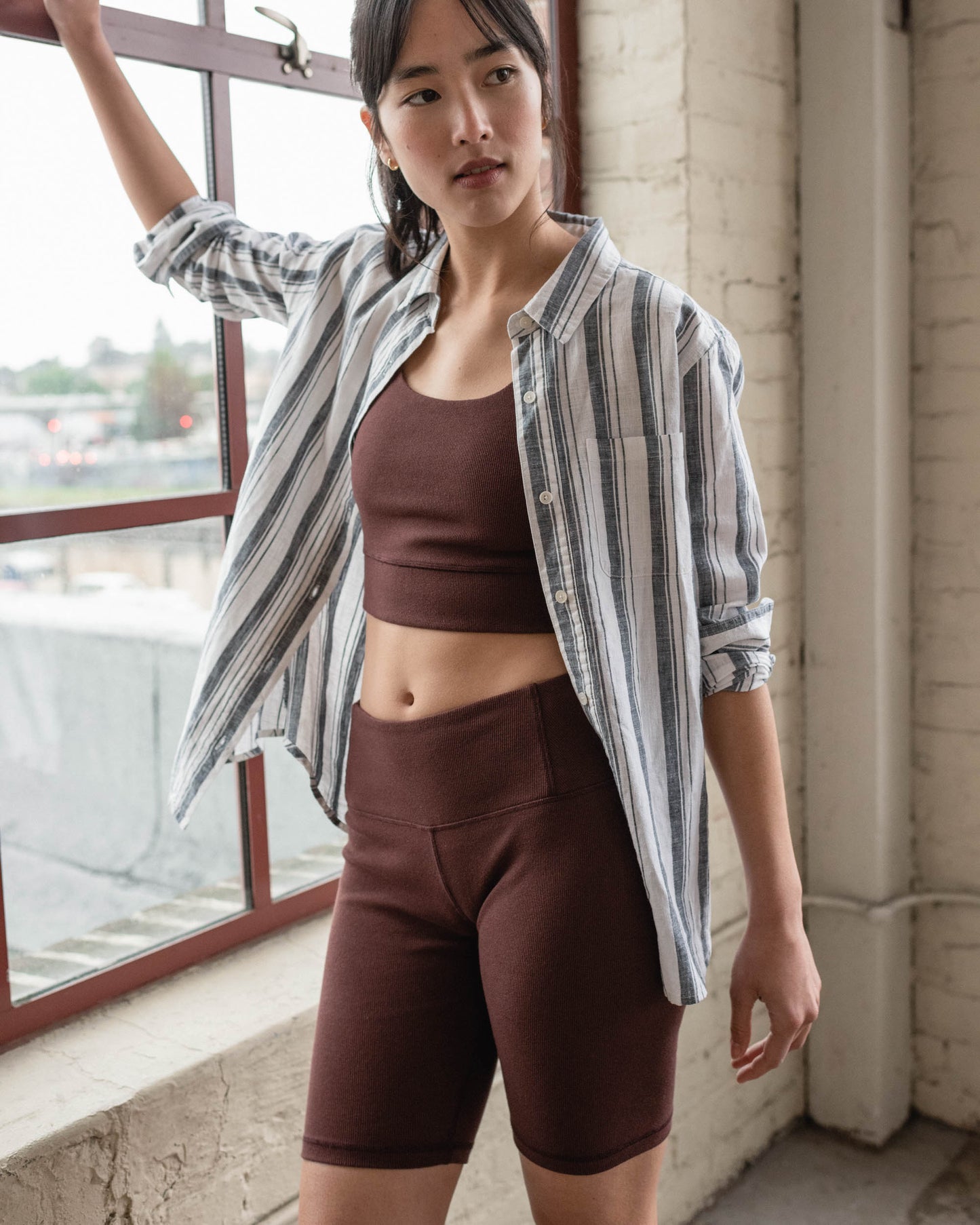 A cozy, ribbed bike short fit for light stretching or heavy lounging. High-waisted, flattering length, and made of a stretchy and comfortable blend of organic and recycled materials.