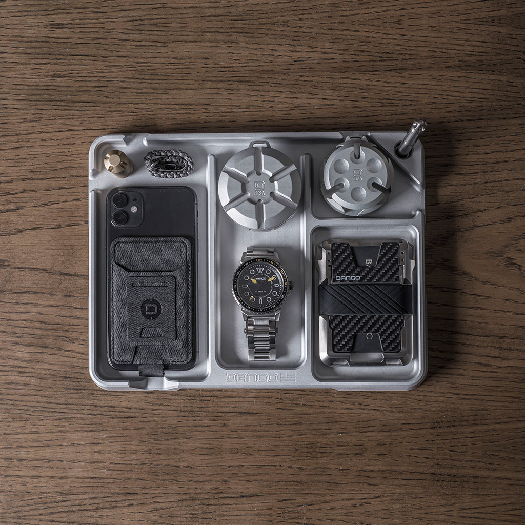The all American made Dango EDC tray is designed to organize & protect your most prized everyday carry items all in one convenient space. Machined from a solid piece of aluminum, it houses 4 different sized cavities to perfectly compliment and store items such as your wallet, keys, coins, jewelry, headphones, capsules, clips, knives or cellphone. The hefty EDC Tray is equipped with anti-slip rubber footing on the underside to protect surfaces and keep it safely in place without sliding or being easily moved around. In addition, cable management and multiple positioned tablet/phone stands are thoughtfully designed into the tray, making it a perfect item to support your tech needs!