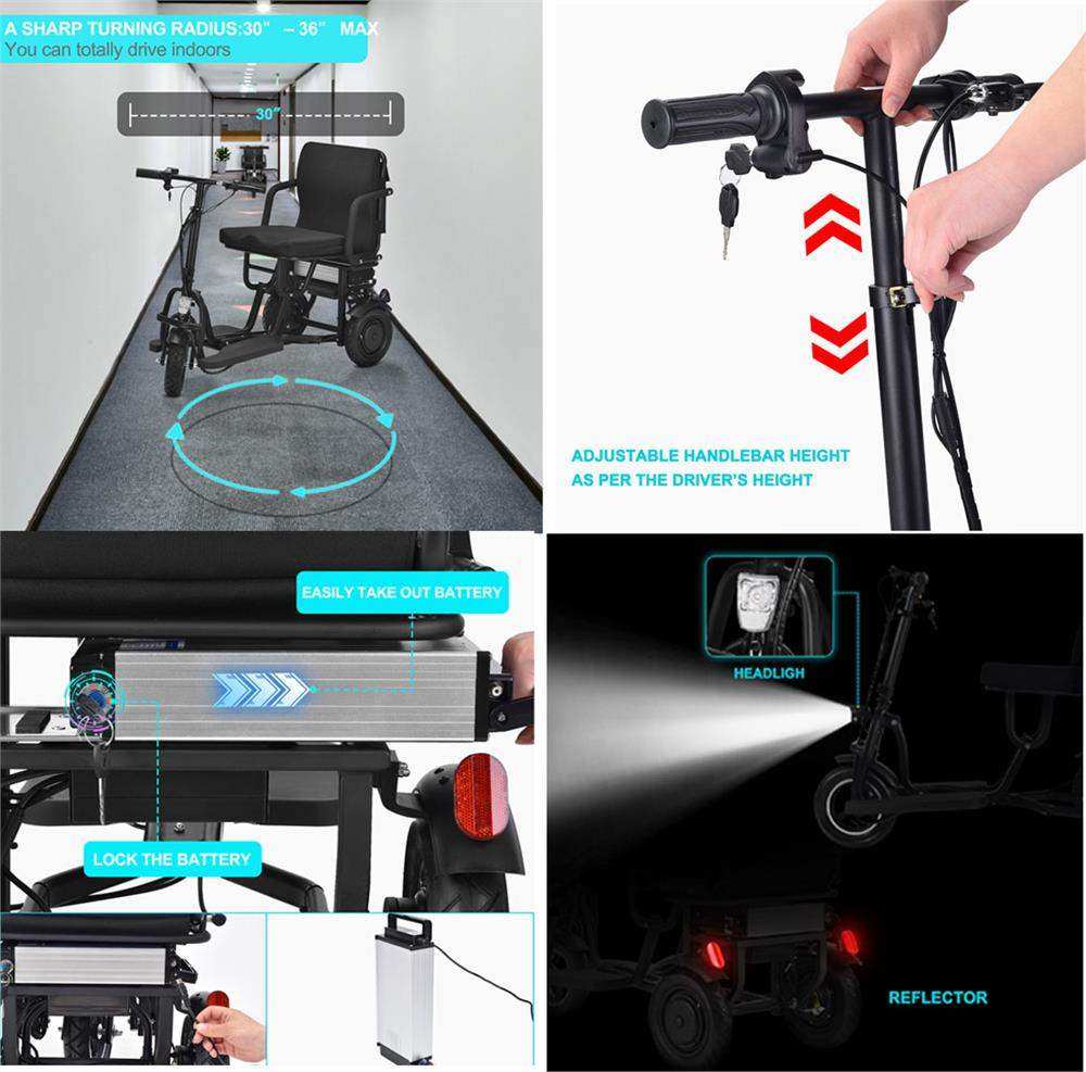 Introducing the new Folding Mobility Scooter by MotoTec. Its compact, three wheel styling makes for a sharp turning radius, 2 hub motors built into the rear wheels provide amazing torque for riding up inclines with its light weight durable frame made from Aluminum. The lithium battery is light weight and lasts longer than your standard lead acid competing models. Comes standard with headlight, rear reflectors, key start, reverse, dual rear drum brakes, comfortable seat with backrest, carrying bag and large 10 inch air filled tires to provide a comfortable ride.