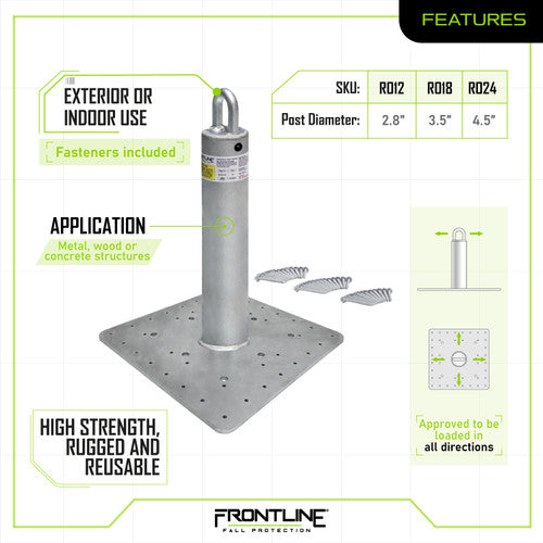 The Frontline Commercial Anchors are designed for a number of applications such as fall arrest, fall restraint and window washing tiebacks. The anchors can be installed in virtually any structural substrate including concrete, metal and wood. These anchors can also be used indoors or outdoors as they are hot dip galvanized in order to withstand the toughest jobsites and the different weather conditions. The commercial anchors are compatible with an extensive use of connecting devices, including self-retracting lifelines, shock absorbing lanyards and vertical and horizontal lifelines. Trust in the durability, reliability and safety of the Frontline Commercial roof anchors when thinking about working at heights and the use of fall protection is required!