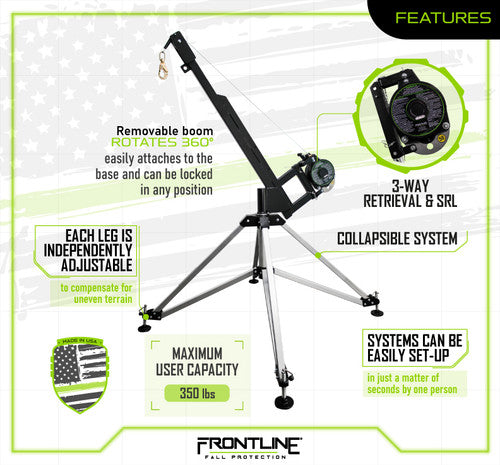 Working in confined spaces sometimes can be extremely hazardous activities where both the entrant and attendant need such equipment that will perform to its limits when put to the test! The Quadpod system is composed of four adjustable legs for better stability and a 360° rotating boom to easily position the fall arrest and rescue point over the confined space entry making it unique and different over other equipment. The Quadpod comes with a 3-way retrieval system that serves to lower, raise, rescue personal and can also be used as an SRL with the simple switch of a knob in just seconds! With the Proudly Union Made in the USA Frontline Patriot™ line, rest assured that you will have some of the best driven quality, durability and reliability confined space equipment out in the market!