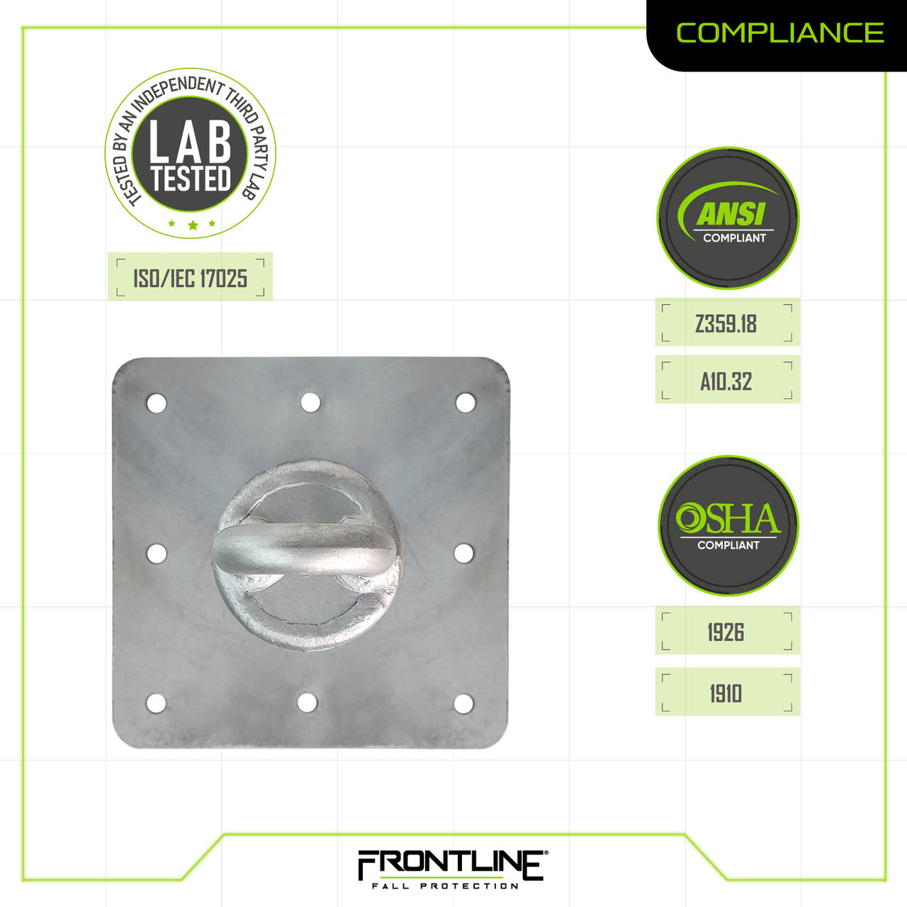 The Frontline Commercial Anchors are designed for a number of applications such as fall arrest, fall restraint and window washing tiebacks. These anchors can also be used indoors or outdoors as they are hot dip galvanized in order to withstand the toughest jobsites and the different weather conditions. The commercial anchors are compatible with an extensive use of connecting devices, including self-retracting lifelines, shock absorbing lanyards and vertical and horizontal lifelines. Trust in the durability, reliability and safety of the Frontline Commercial roof anchors when thinking about working at heights and the use of fall protection is required!