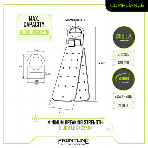 The Frontline hinged reusable roof anchor can be easily mounted on structural roof members. The roof anchor can be used either at the roof peaks or surface mounted onto the roof structures.