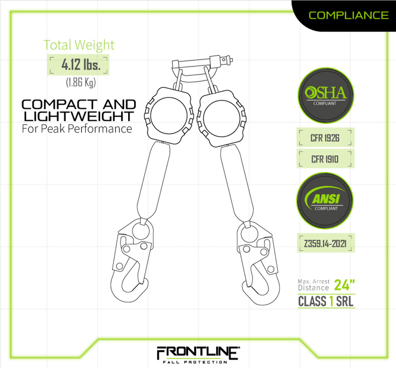The Frontline Self Retracting Lifelines are your go to solution when working at heights, and a quick safety reaction is of the upmost importance! Engineered to perform and engage within seconds if subject to a fall, Frontline SRL’s help limit free fall distances and lessen the impacts generated on the body for a safer working experience. Manufactured to exceed expectations and tested by an independent third party ISO 17025:2017 accredited lab, these SRL’s are built rugged, built to last and built to give users the consumer confidence needed to perform their jobs with peace of mind when fall protection is required.