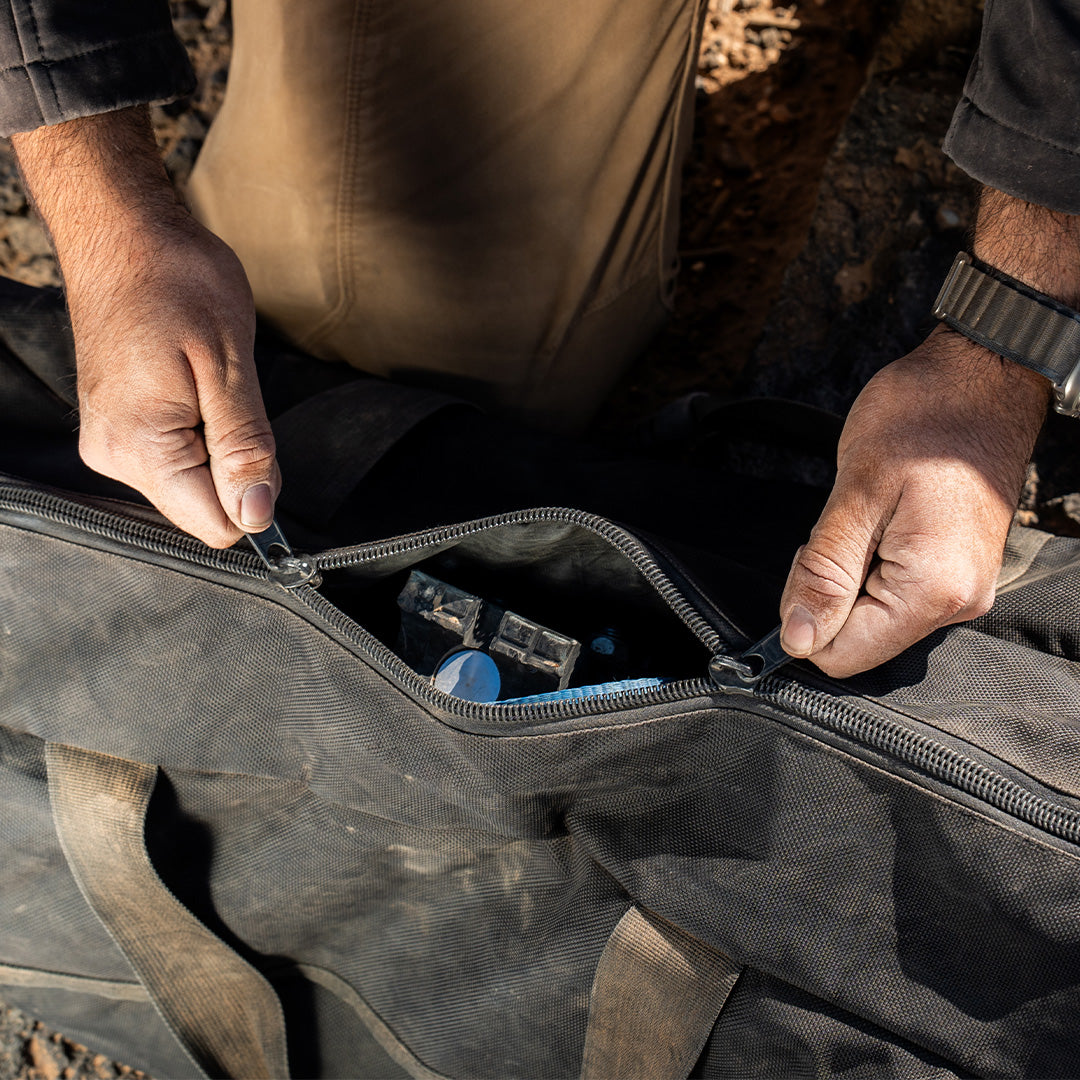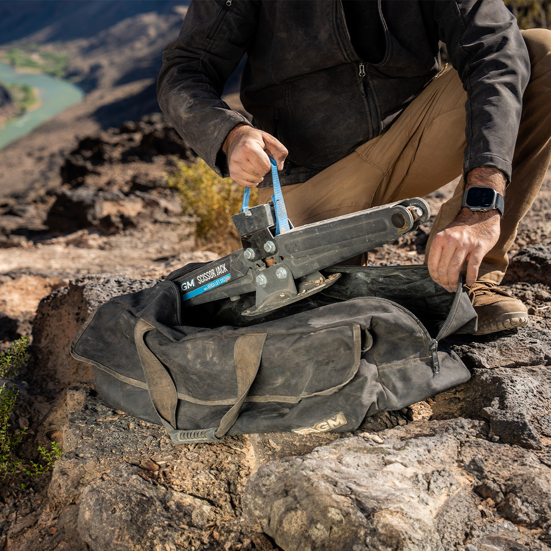 Introducing the GO-Bag the ultimate travel companion for adventurers on-the-go! Made from abrasion resistant Ballistic Nylon, with easy grab rubber grips and low profile straps, this bag is durable and comfortable to carry. Featuring a solid plastic floor insert to maintain its shape, a large, Velcro sealed, outside storage pouch, and multiple inside pockets, it's perfect for organizing all your essentials. The heavy duty zipper opens from both sides, revealing a spacious center compartment that can hold a Manual Jack PRO, and many of the new Jacks set to release in the coming months.
