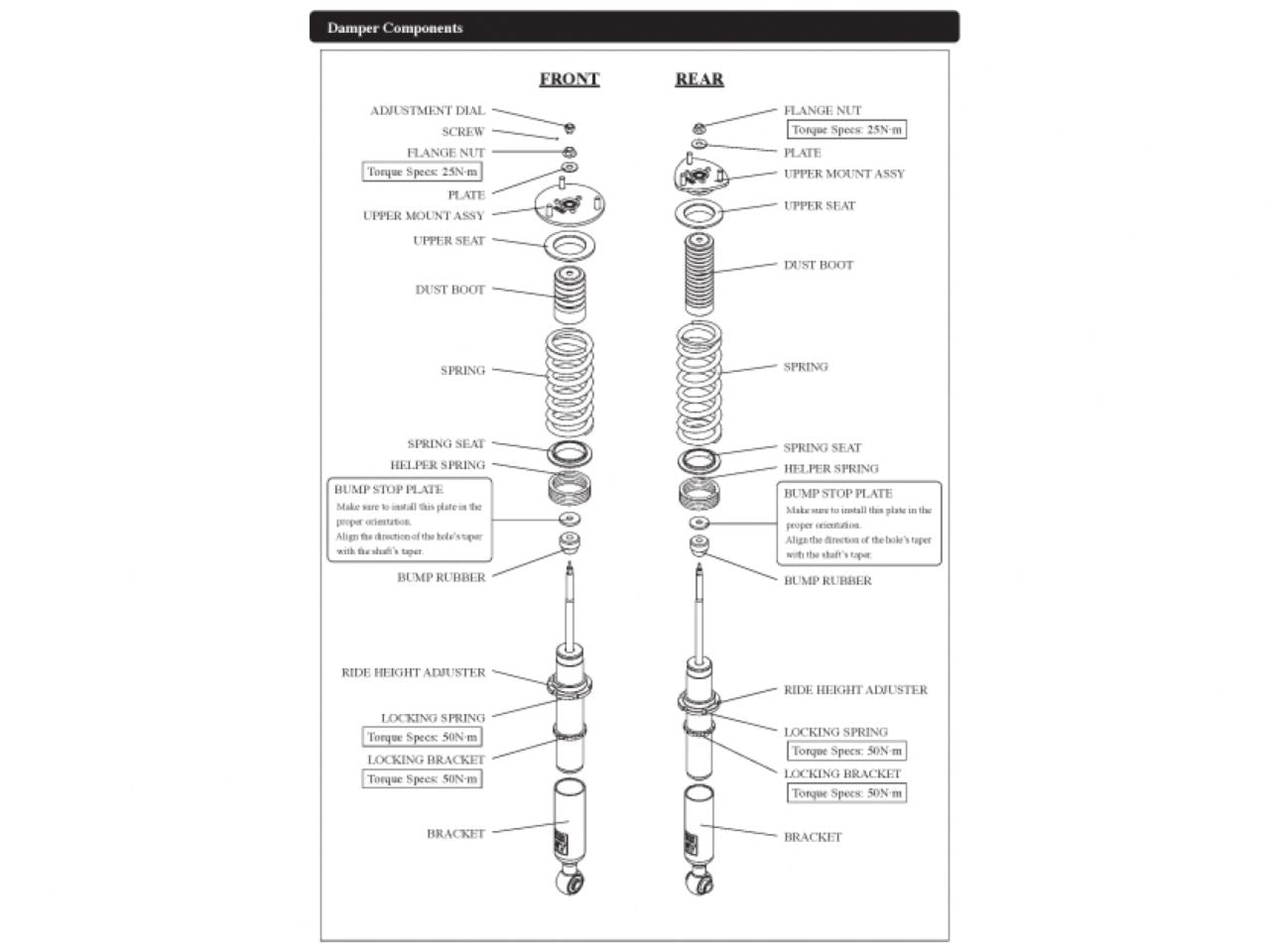 Damper oil leakage or any other problems caused by low ride height setting from the factory setting will void the warranty of the product.)