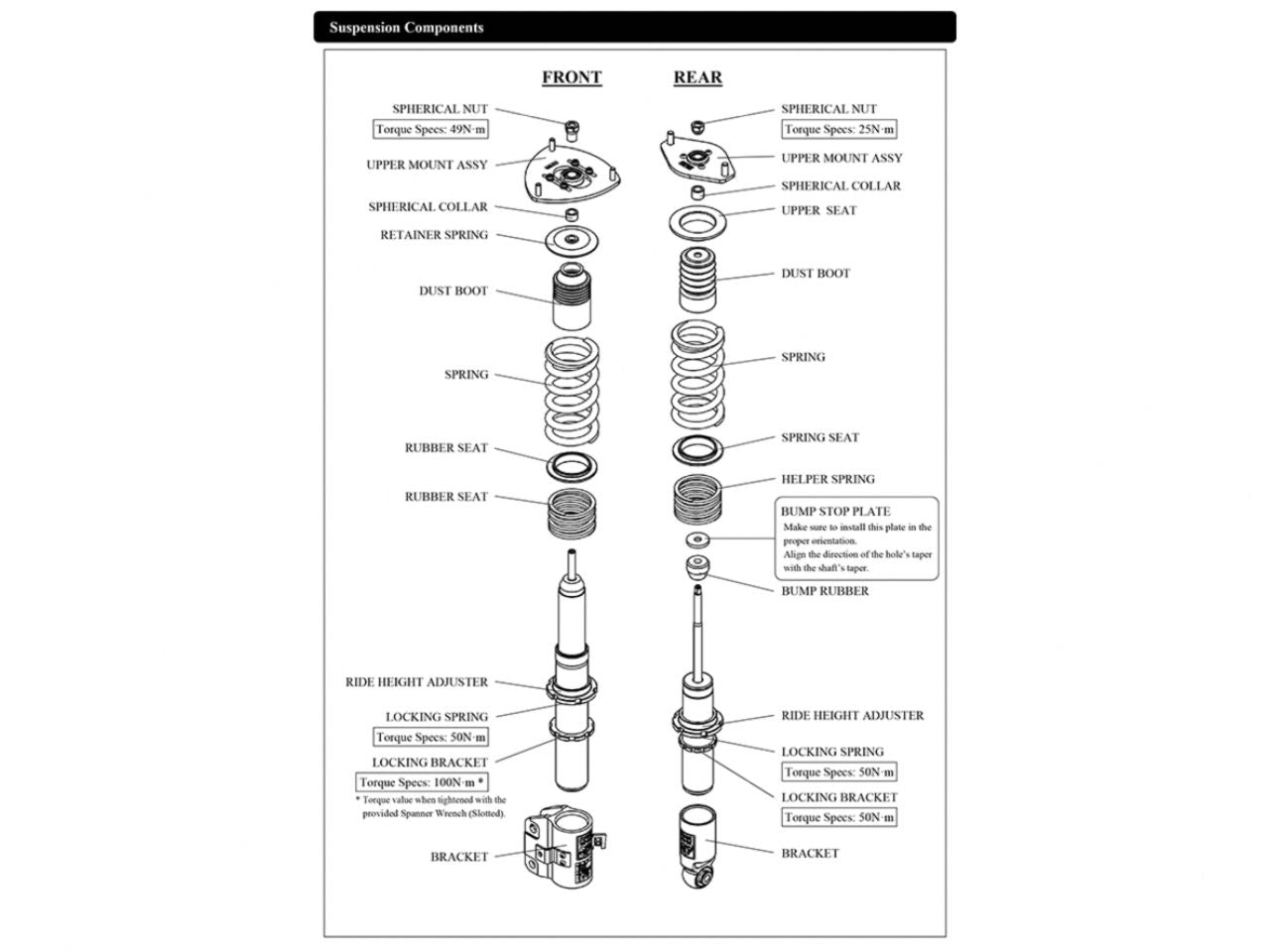 - In order to reduce unsprung weight, bracket, ride height adjusters and lock nuts are made from aluminium. (Not for all vehicles)