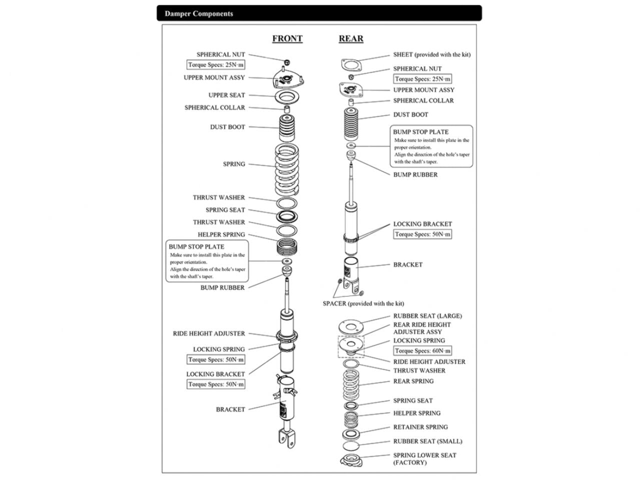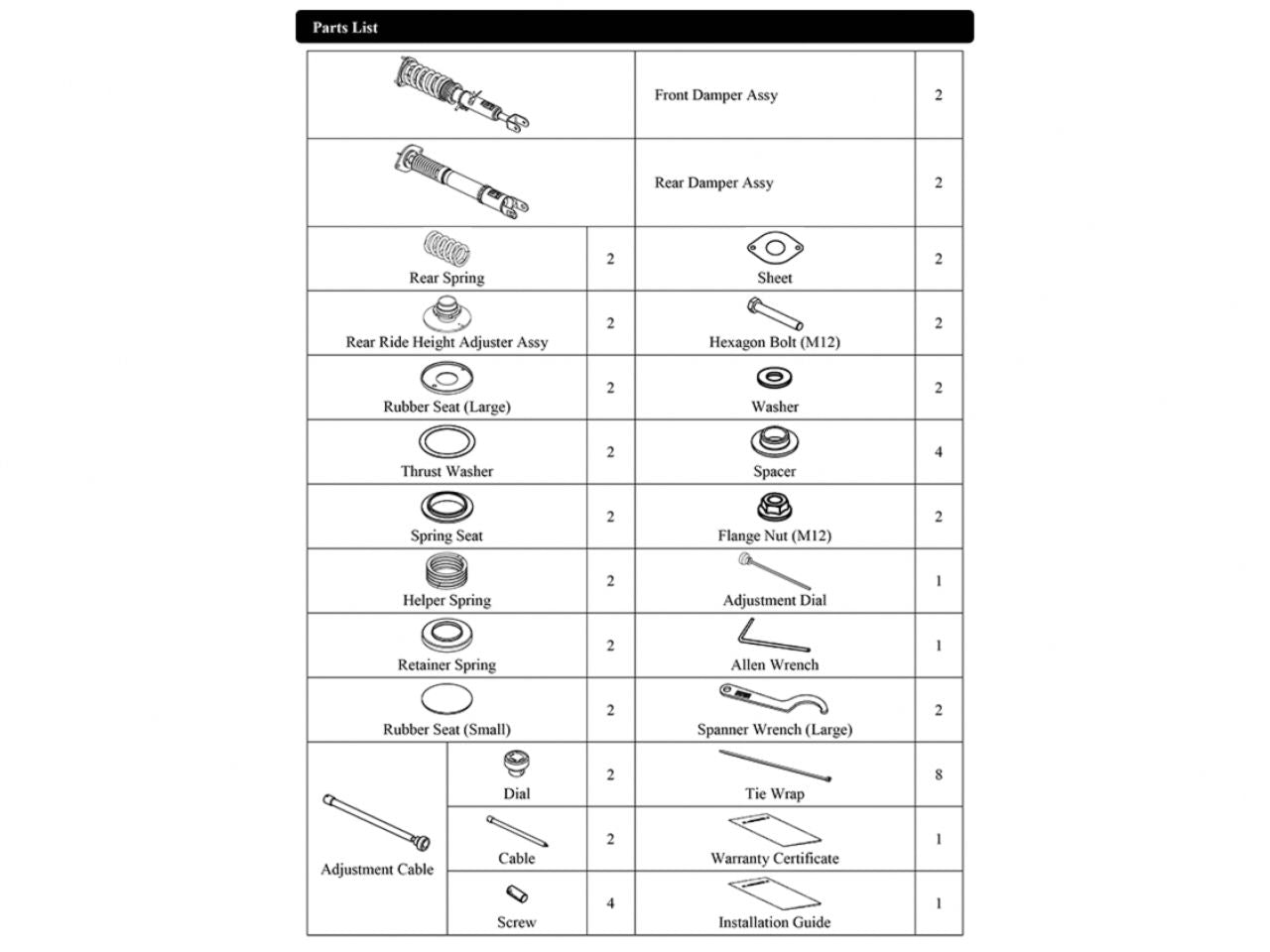 - In order to reduce unsprung weight, bracket, ride height adjusters and lock nuts are made from aluminium. (Not for all vehicles)