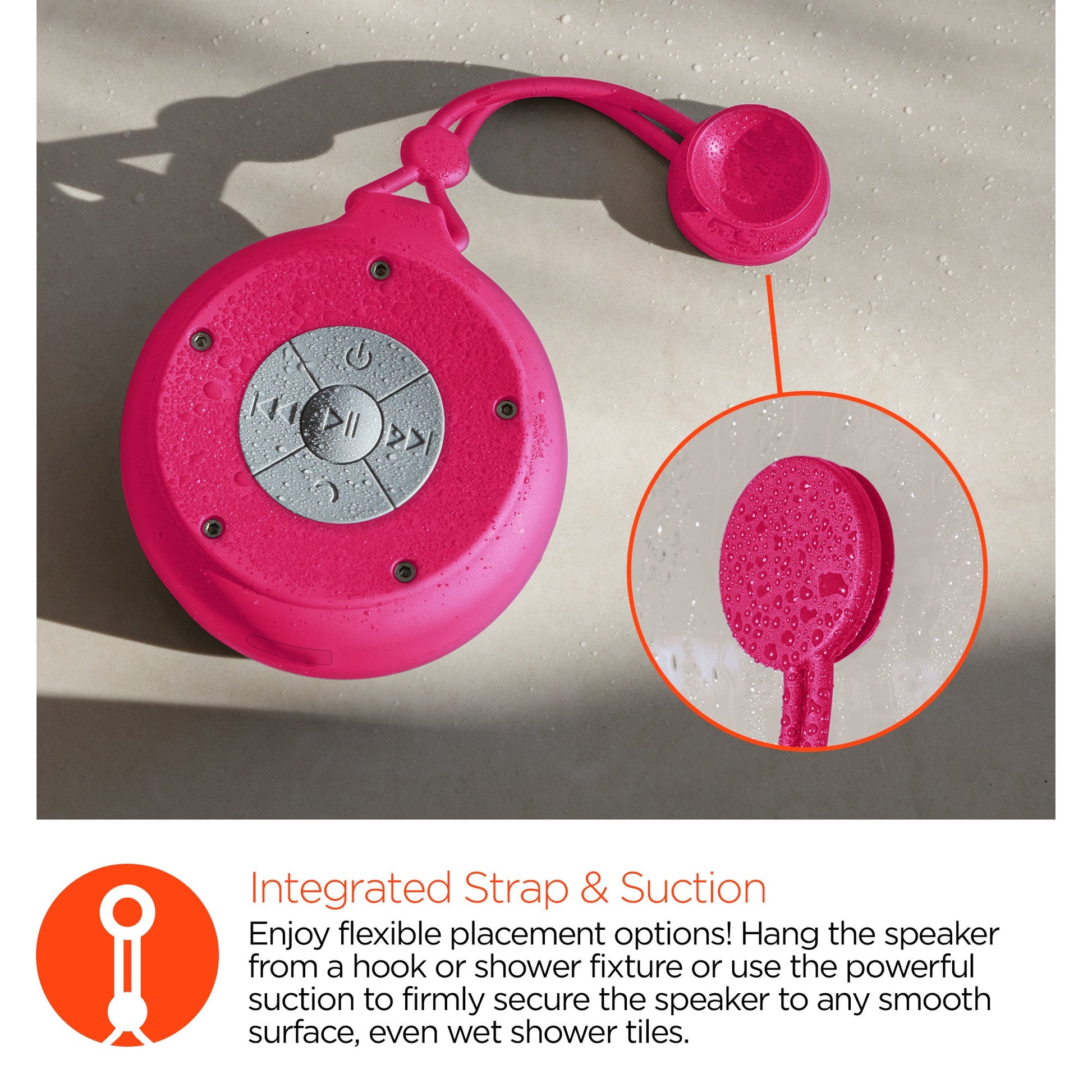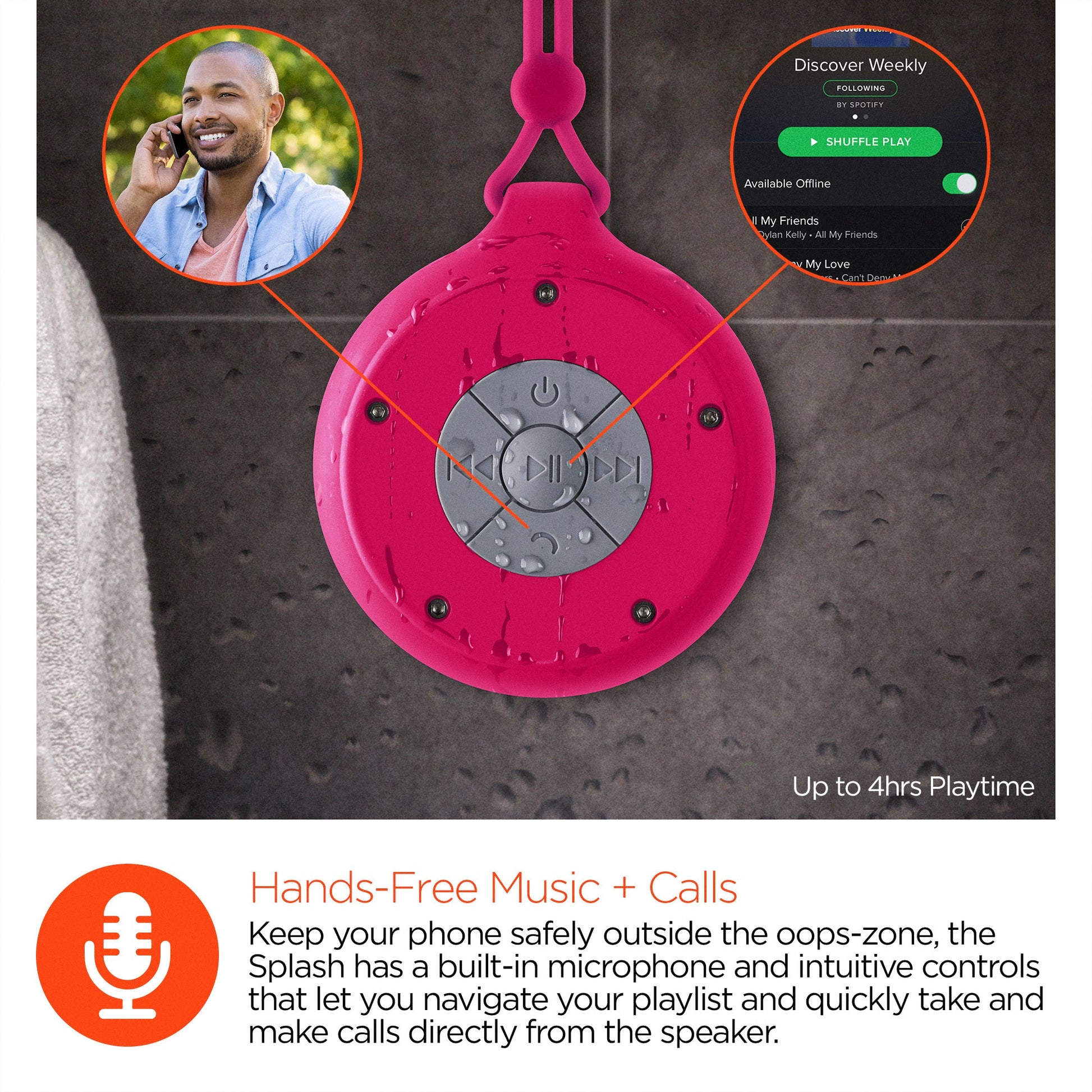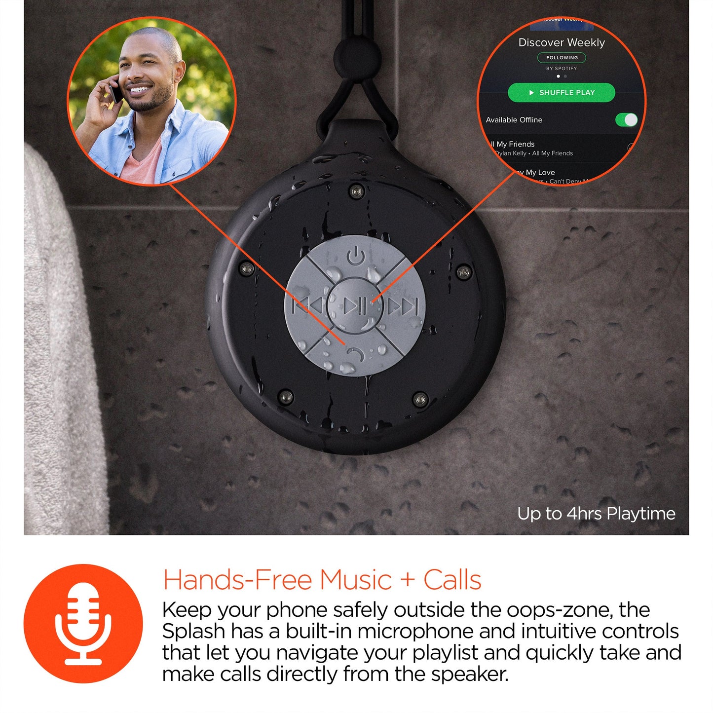 Splash is a wireless Bluetooth speaker specifically designed for the shower, but so lightweight and portable, you can use it anywhere. The strong suction cup holds the speaker firmly to any smooth surface, even in the wet, tiled shower. With a 33ft wireless range, your device can stay safe and dry while you're belting out tunes in the shower. The built-in remote and microphone let you take and make calls, control your playlist, and adjust the volume all directly from the speaker. Fully charged, this compact powerhouse plays for up to 4 hours. With the Splash, you can take the party with you and never miss a beat or a call!